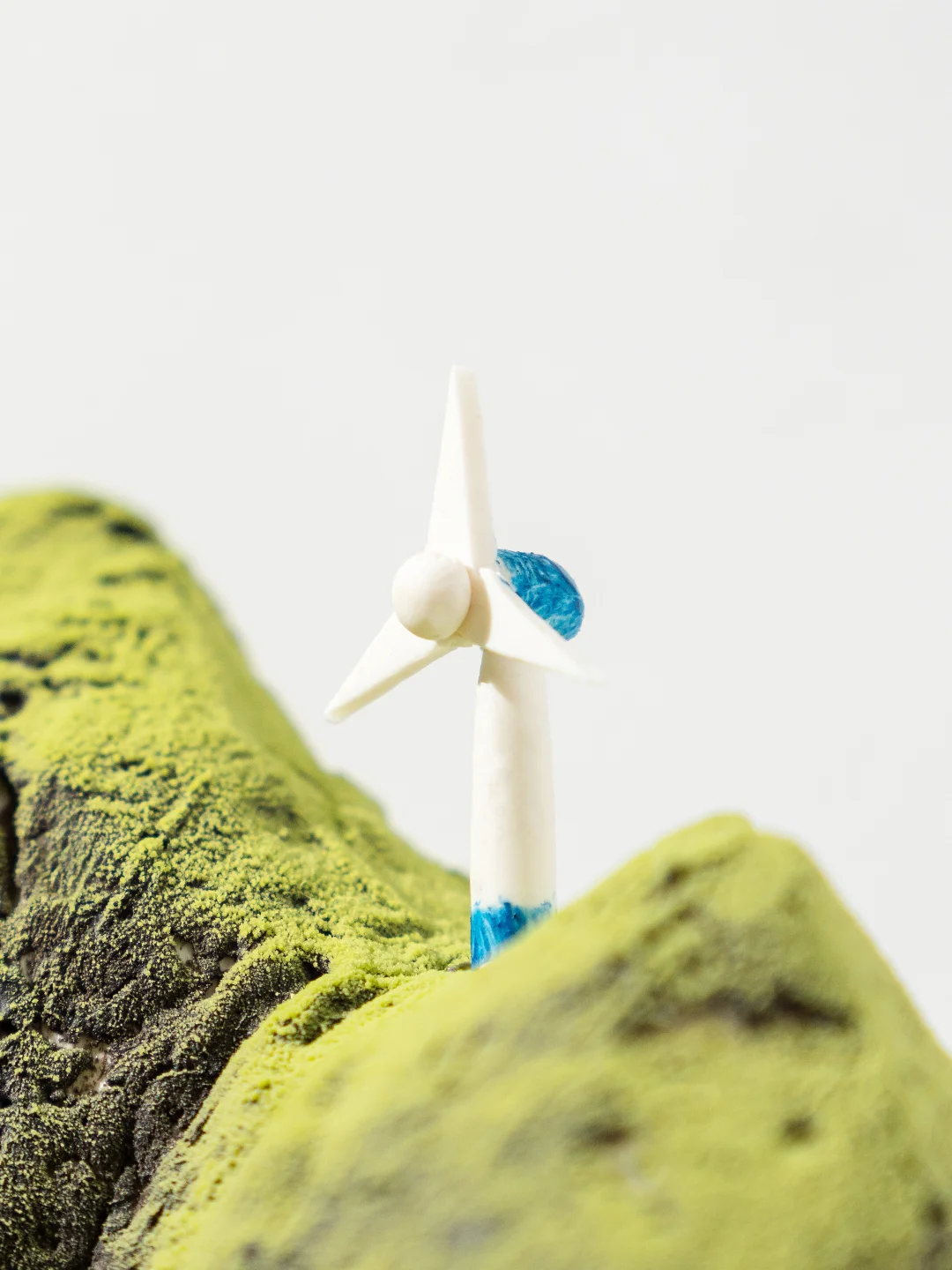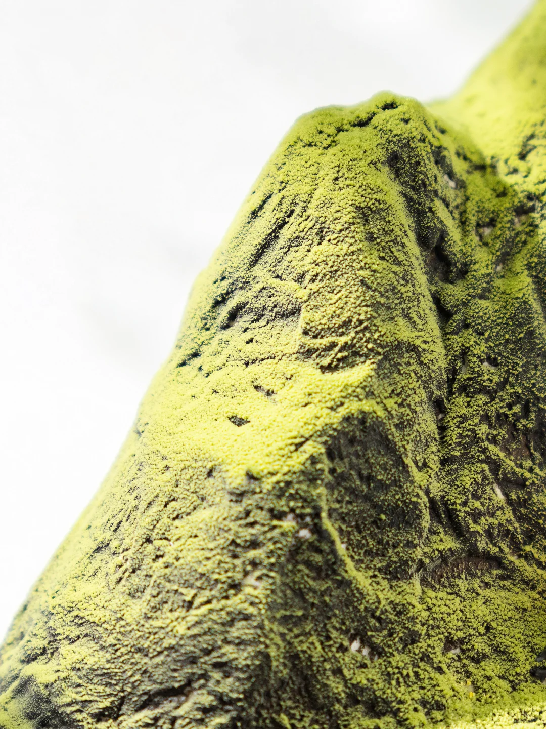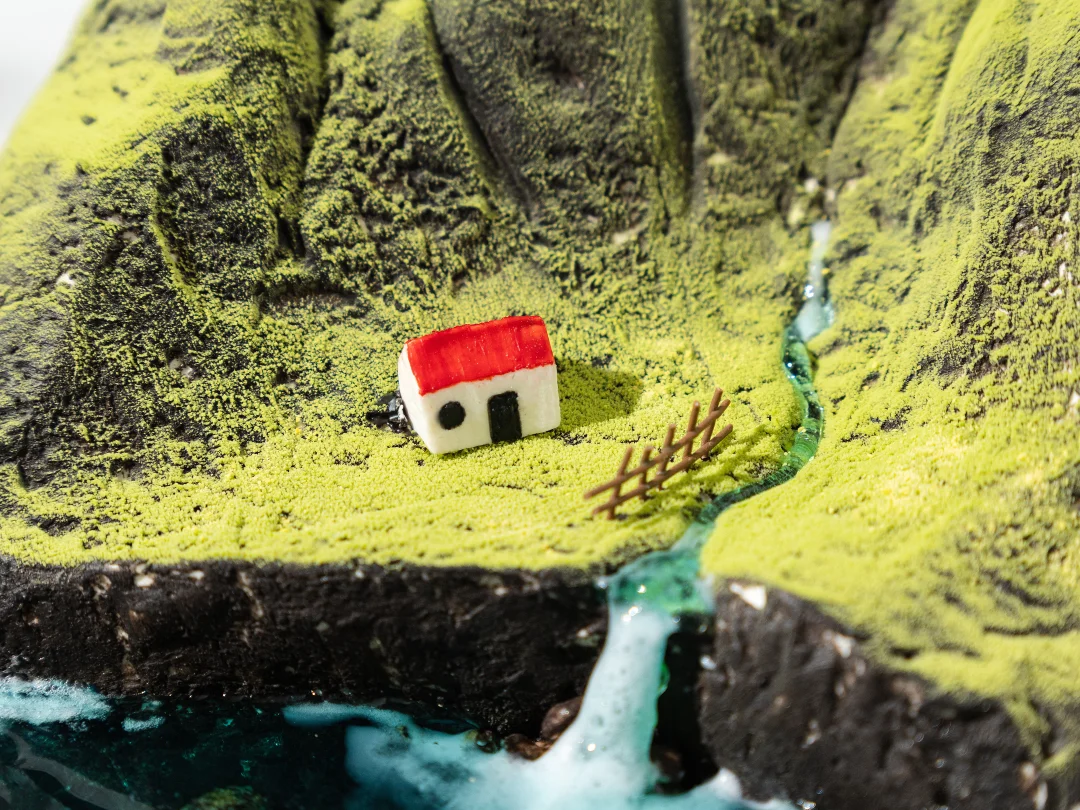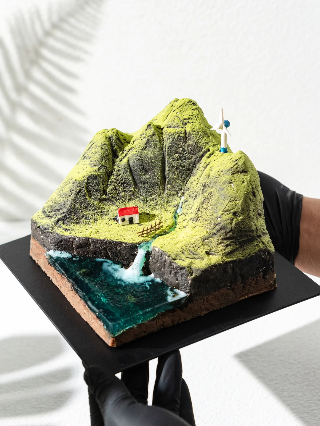 2、整体塑型好后均匀抹上一层黄油霜,用小抹刀在表面滑出山谷纹路,放入冰箱冷冻10分钟,取出后整体刷上一层黑色喷砂液,再在底部侧边刷上棕色,冷冻15分钟后从山峰后侧喷涂绿色,温度为35-40°C。