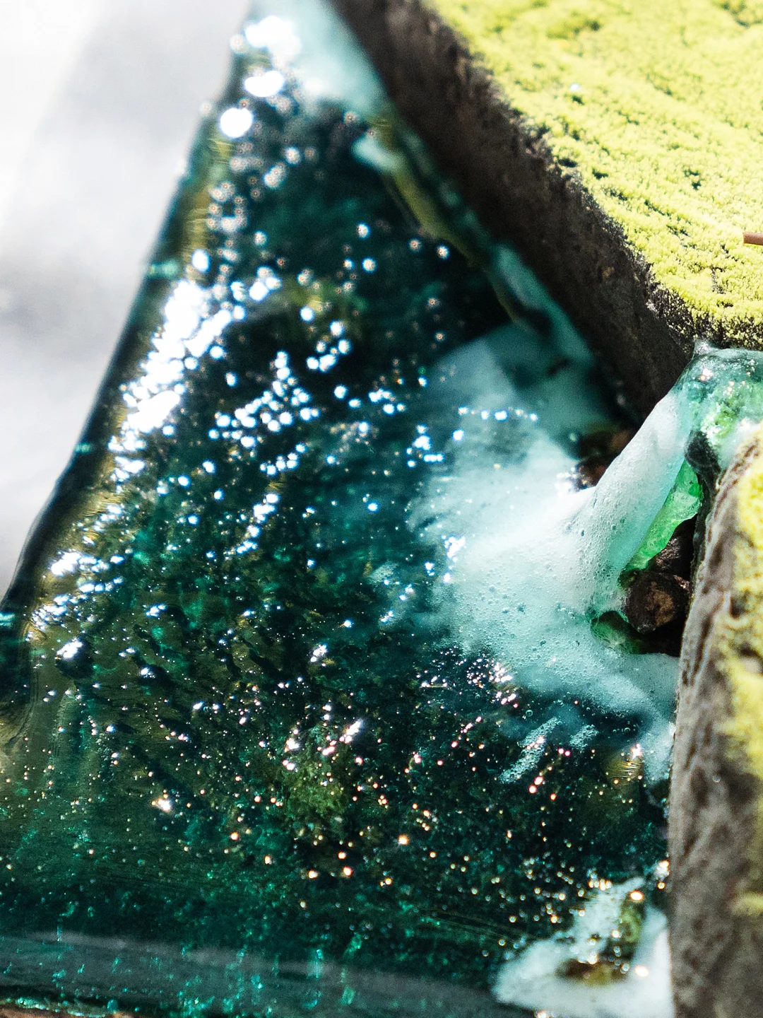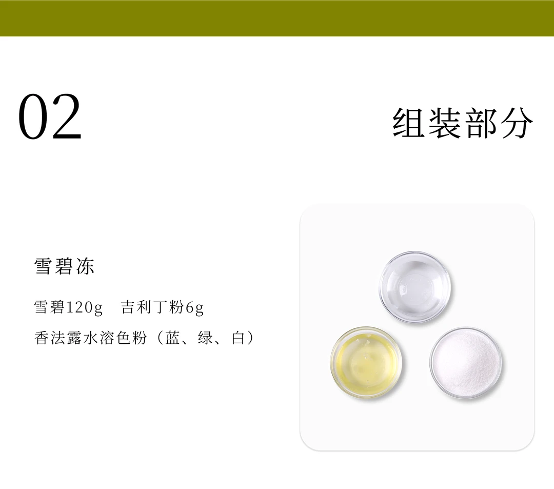 雪碧和吉利丁粉搅拌均匀静置浸泡5分钟加热至完全融化后,取少部分倒入另个碗中,多的部分加入蓝色和绿色水溶色粉调成蓝绿色,另一部分加适量白色色粉调白。