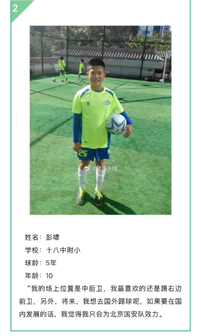 15年,年仅10岁的彭啸接受“教育圆桌杯”少儿足球赛采访时说: