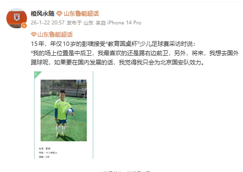 直播吧01月22日讯今日,著名山东泰山博主橙风永随晒出彭啸10岁时一张照片。