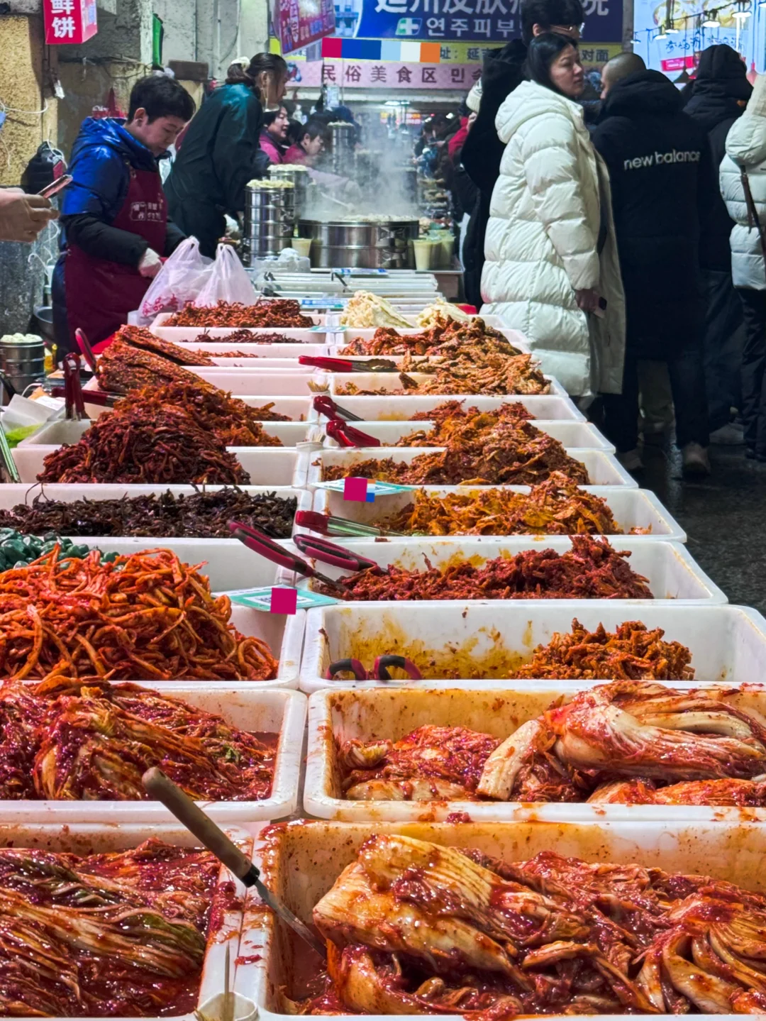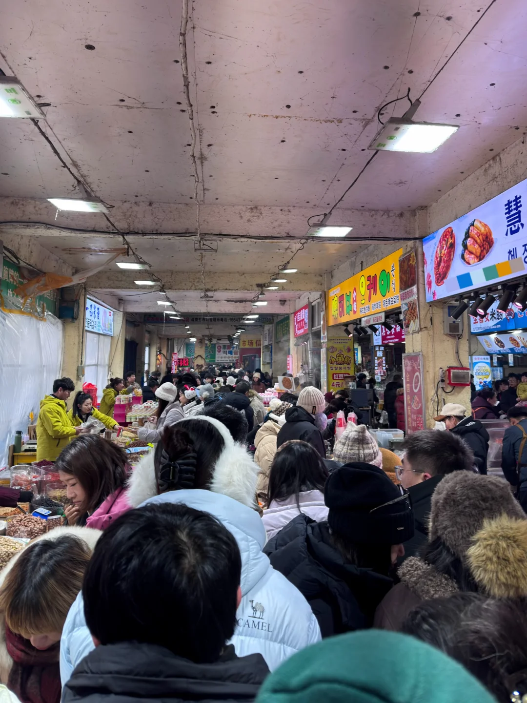 说下我自己的直观感受,若说里面东西比外面便宜倒也没太大感觉,主要就是图个热闹,重在体验。 🙋会有人问跟哈尔滨红专路早市比咋样? 😌我想那是我最辛苦的一趟旅游,早上4点多起来逛红专路早市,往后几年我都没有再起那么早过。 [向右R][向右R][向右R]相比哈尔滨红专路早市 ❎延吉的水上市场不用起那么早,哈哈哈! ✅哈尔滨红专路早市是占道经营,所以就一定要赶早,凌晨4点多哈尔滨,我是记忆犹新。 ✅延吉水上市场其实就是个菜市场,有门有大棚里面是固定摊位,所以就不用太赶时间,一个上午都可以逛。 [向右R][向右R][向右R]至于区别,或者说业态? ☑️哈尔滨红专路早市是个大集,啥都有。 ☑️延吉水上市场是菜市场,以吃喝为主。 🈶我早上8点过去,当天下雪,还有点堵车。 🈶9点里面还是人挤人,所以大家不用赶早。 [打卡R][打卡R]关于水上市场位置 [拍立得R]距延大网红墙不远,隔着人民公园过河就是 🚗打车到话直接导‘延吉水上市场’ 🚌水上市场门口有到朝鲜族民俗园公交车 水上市场有两大门,每个门对应1个过道 每个过道两边都有摆摊儿,就是4排摊位 正好两个大门一进一出不走回头路🔁 ➕卖的东西挺全乎的,以吃喝为主 ➕坚果干货、泡菜、朝鲜族小吃。 ❎我没有要推荐的吃的 🫰每个人口味不一样,出来玩满足自己很重要,挑自己喜欢的吃的就好!! 🫰我自己买了3种饼,1盒草莓1盒蓝莓。草莓很甜蓝莓踩雷,3种饼的名字我都没记住,其中一个饼被我放在包里到了晚上在飞机上吃完。。 ///////////////当然也有需要注意的 ‼️‼️买干货还是要仔细挑一下,特别是需要邮寄的朋友。 ‼️‼️然后就是这边的蓝莓,品质有点参差不齐!!多看多思考。 ‼️然后就货比三家啦~~~适合自己的最重要 ‼️然后就是!注意安全啦,冬天都是大棉袄,有些边吃边拍照的,不小心会擦到衣服上~