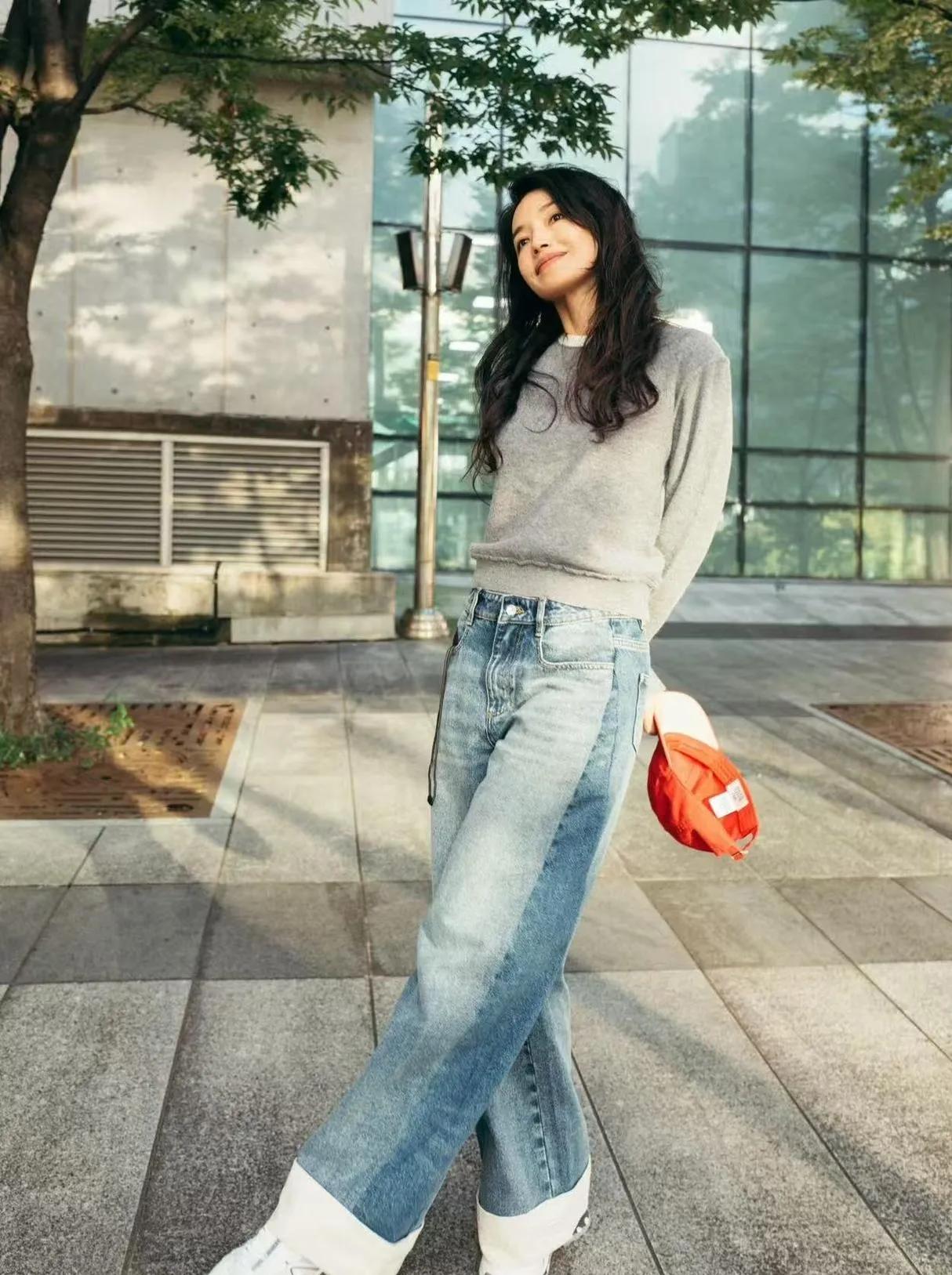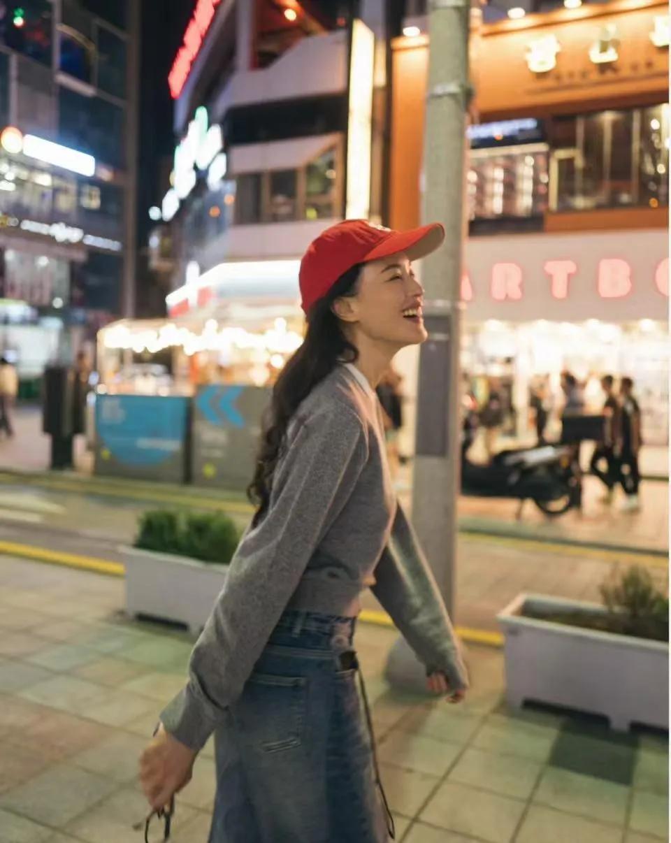 舒淇的冻龄松弛感赢麻了✨ 灰色针织衫+翻边牛仔裤+红帽,随性又减龄,笑容甜得