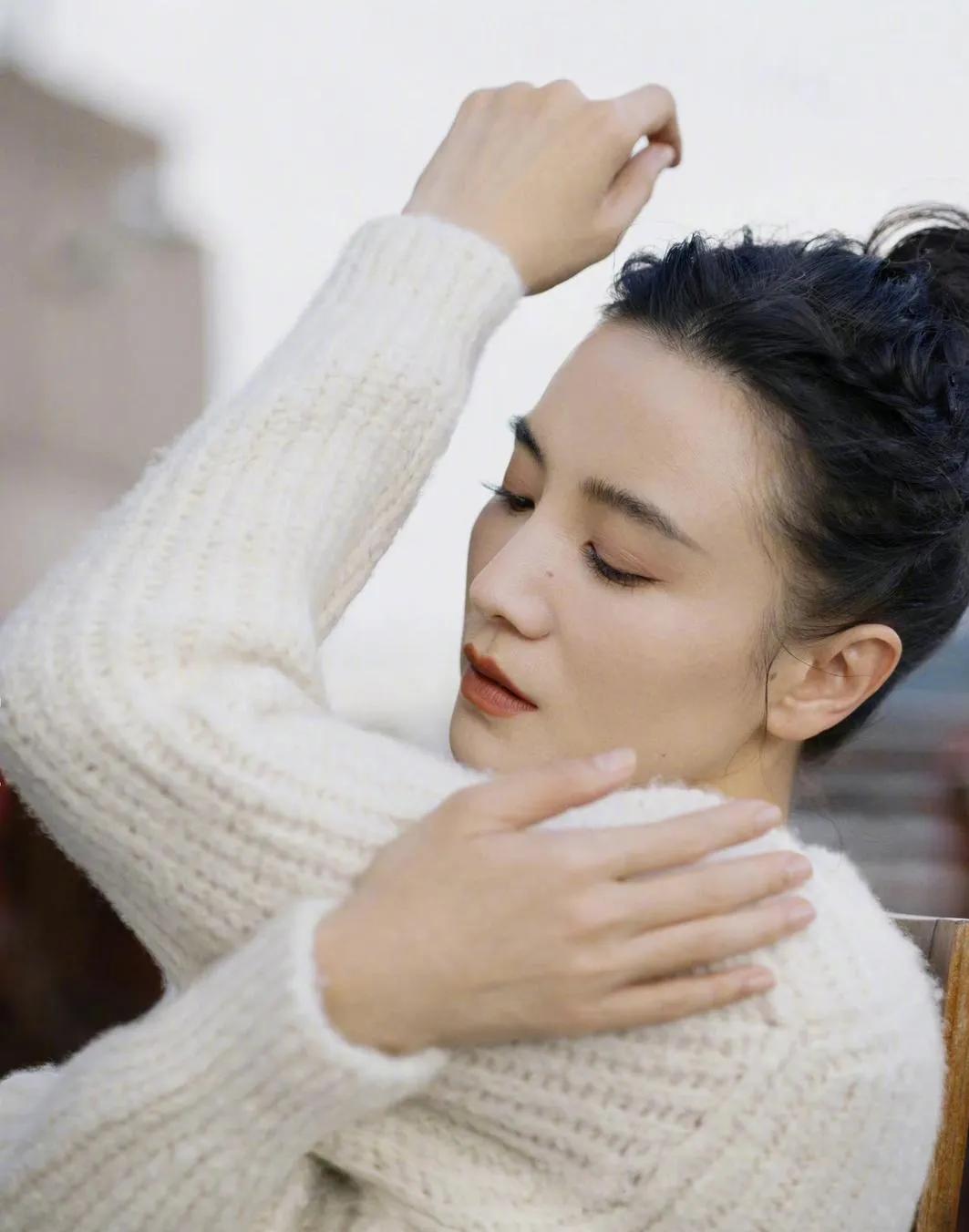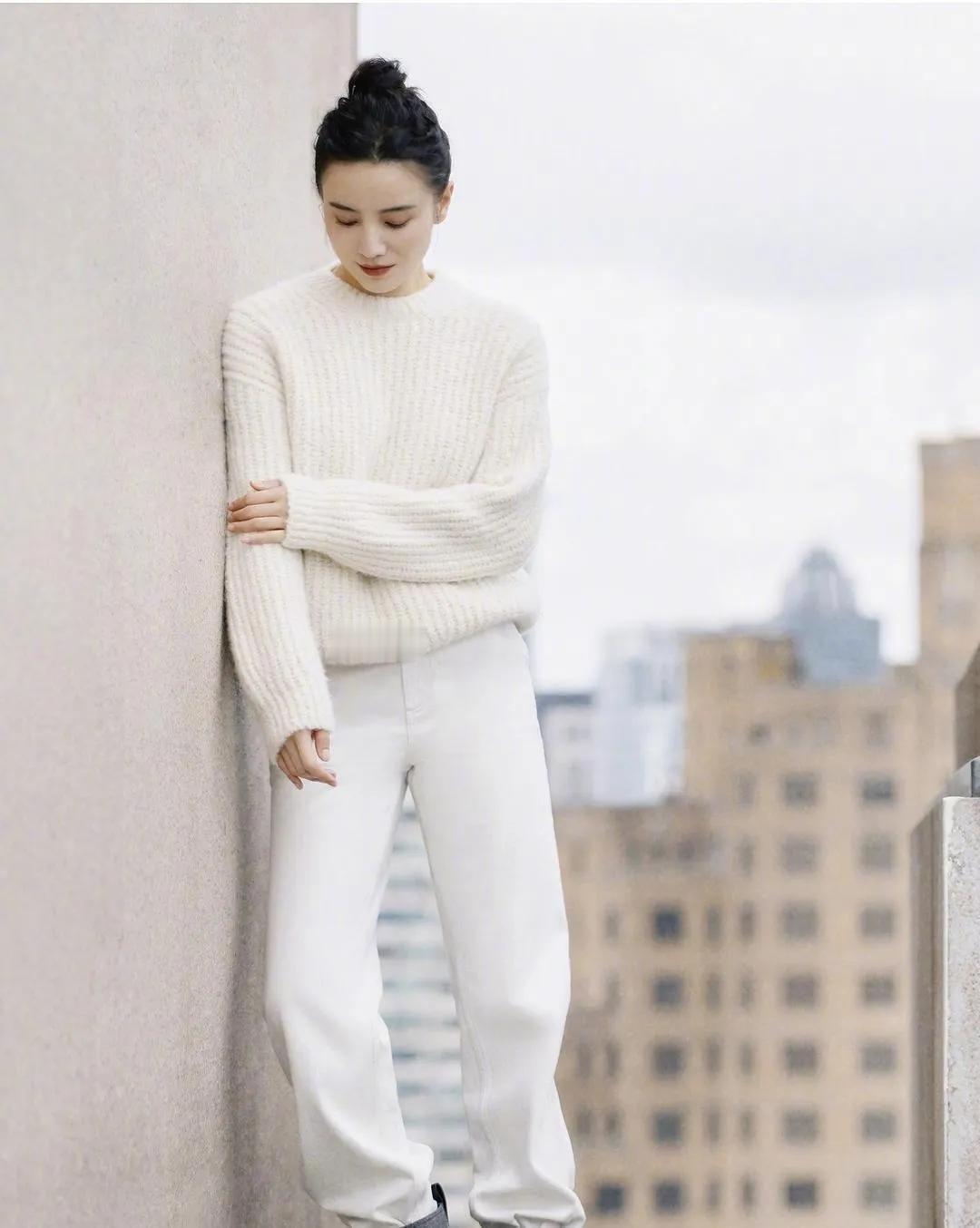 宋佳这气质,是刻在骨子里的高级✨ 一件白毛衣+白裤子,丸子头一扎,清冷松弛感