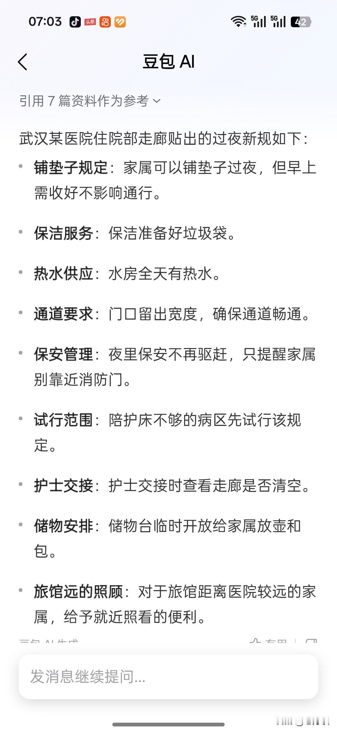 武汉某医院贴出了住院部过夜的温馨新规定,允许病人家属在不影响大家通行的情况下,在走廊里铺上垫子过夜。这项政策一经公开,受到了广大病友的热烈欢迎和认可。只有经历过医院陪护的人才知道,病人家属陪护是多么煎熬的事情。曾经经历过赔付一个月的经历,实在是太痛苦了。如果是租床,那么要 10 块到 20 块钱一晚上放在病房里,如果不在医院租行李床,那么就没有地方睡,那么晚上怎么过是一件很煎熬的事情,因为病床是不允许病人家属在上面过夜的,即使是空置的病床也不行!