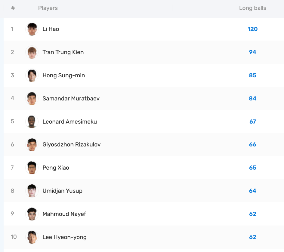 值得一提的是,中国U23球员彭啸同样进入前十,以65次位列第七。两名球员同时上榜,让中国U23在“后场到前场的直线输送”和“快速推进”这一环节的存在感极强。