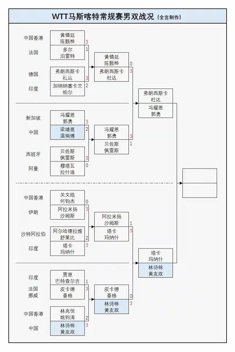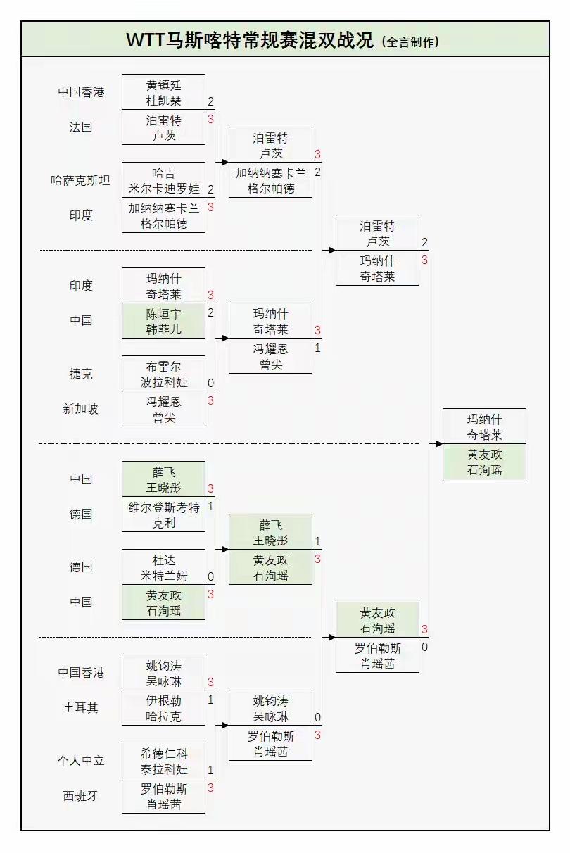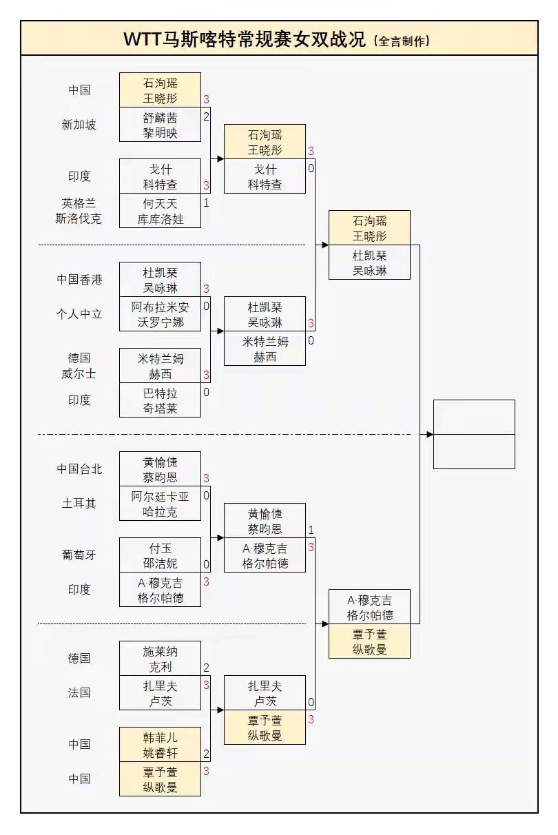 【WTT马斯喀特挑战赛最新战况】 1、男单: 林诗栋3-2西多仁科 11-4,7-11,13-11,7-11,11-8 温瑞博3-0杜达 11-8,11-7,11-9 向鹏1-3安东·卡尔伯格 5-11,8-11,11-6,7-11 黄友政1-3黄镇廷 11-9,4-11,4-11,4-11 陈垣宇3-0沙姆斯 11-3、12-10、11-9 陈俊菘3-1加奇尼 11-7、7-11、11-7、11-5 达科3-0马纳什 弗朗西斯卡3-2格拉斯门科 1/4决赛对阵如下: 林诗栋vs 达科·约奇克 帕特里克·弗朗西斯卡vs 黄镇廷 陈垣宇vs 安东·卡尔伯格 温瑞博vs 陈俊菘 2、女单战况: 何卓佳3-0叶伊恬 11-4,11-3,11-2 杨屹韵0-3郑怡静 5-11,6-11,5-11 覃予萱3-1单晓娜 11-7,11-9,9-11,11-6 石洵瑶3-2巴特拉 10-12,11-2,11-5,14-16,11-9 纵歌曼3-0胜阿布拉米安 11-9、12-10、11-9 1/4决赛对阵如下: 石洵瑶VS曾尖 纵歌曼VS覃予萱 何卓佳VS安娜·赫西 杜凯琹VS郑怡静 3、男双战况: 林诗栋/黄友政3-0皮卡德/豪格: 1-5,11-7,11-7 半决赛对阵: 林诗栋/黄友政vs塔卡/玛纳什 冯耀恩/郭勇vs弗朗西斯卡/杜达 4、女双战况: 石洵瑶/王晓彤3-0戈什/科特查 17/15,11/9,11/7 覃予萱/纵歌曼3-0扎里夫/卢茨 11/5,11/7,11/2 杜凯琹/吴咏琳3-0米特拉姆/赫西 12/10,13/11,11/6 格尔帕德/穆克吉3-1黄愉偼/蔡昀恩 9/11,11/5,11/6,11/4 女双半决赛对阵如下: 石洵瑶/王晓彤vs杜凯琹/吴咏琳 覃予萱/纵歌曼vs格尔帕德/穆克吉 5、混双战况:(半决赛) 黄友政/石洵瑶3-0罗伯勒斯/肖瑶茜 12-10、11-9、11-3 决赛迎战印度组合玛纳什·沙/奇塔莱,锁定一枚奖牌! 1月23日是考验国乒的一天,近一半选手将一日双赛,且间隔很短。希望国乒再获佳绩!