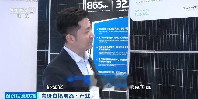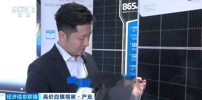 天合光能副总裁陈奕峰:白银主要在太阳能电池里面充当一个接触电极的作用,这个光伏组件的功率是740瓦,里面用到的白银差不多是9毫克每瓦,换算下来一整块光伏板的白银用量是6.6克,相当于一个中等偏上的银戒指的重量。