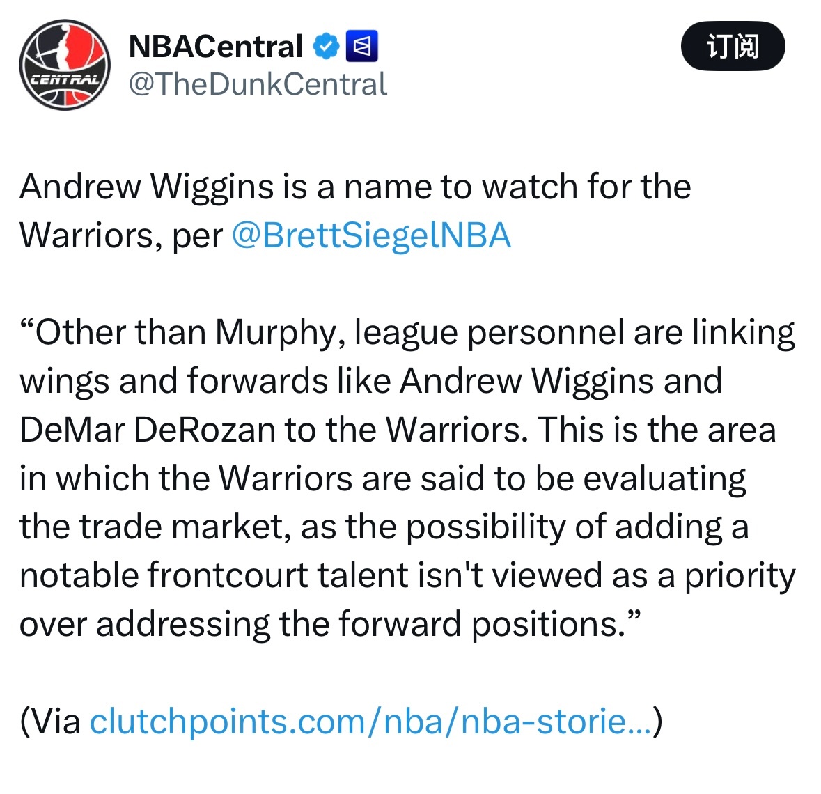Brett Siegel:维金斯是勇士队关注的名字。“除了墨菲,联盟内部人士还将维金斯、德罗赞等锋线球员与勇士队联系在一起。据称,勇士队正在评估这一位置的交易市场,相比引进出色的内线球员,解决锋线位置的需求被视为更优先的事项。”