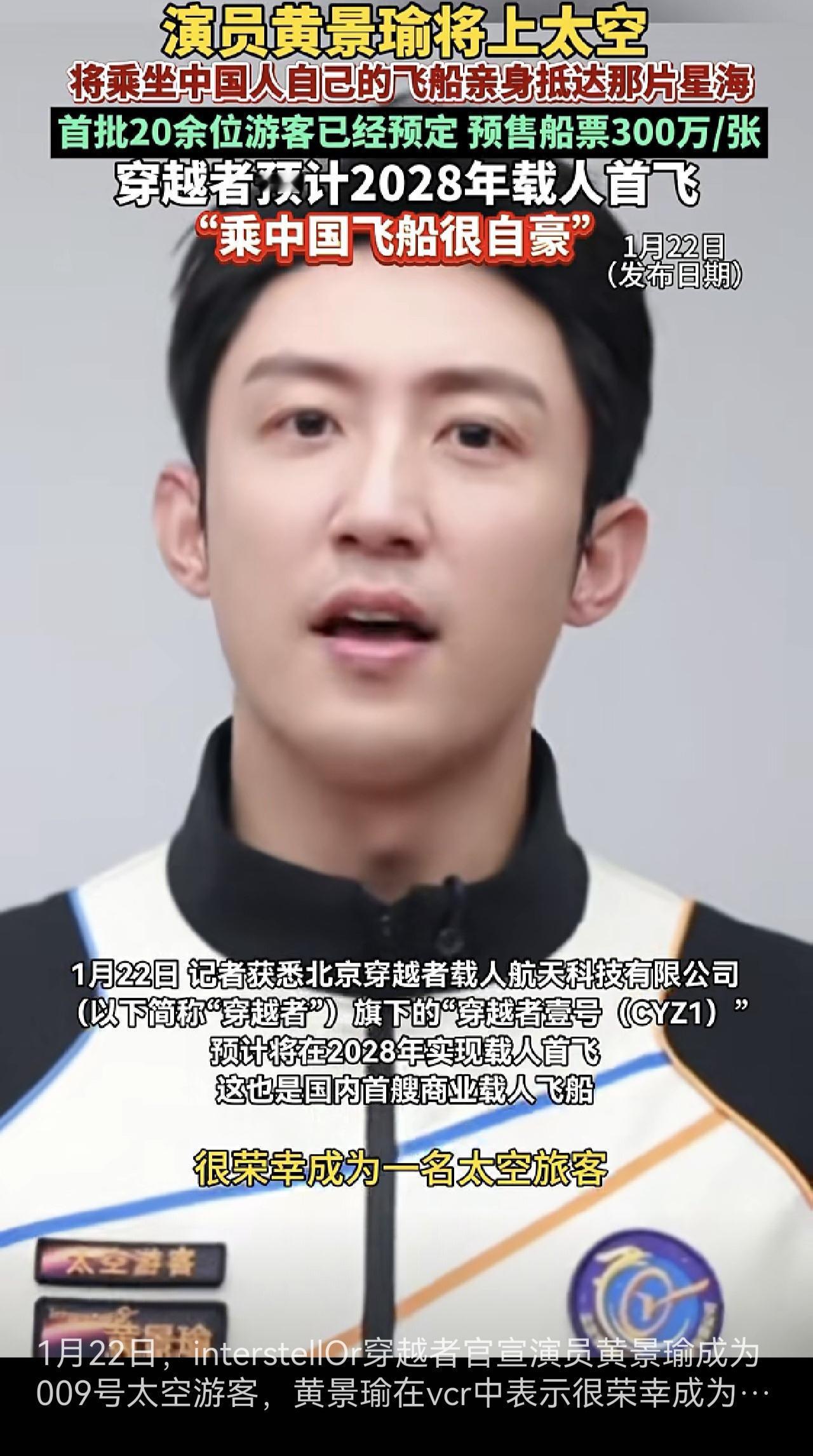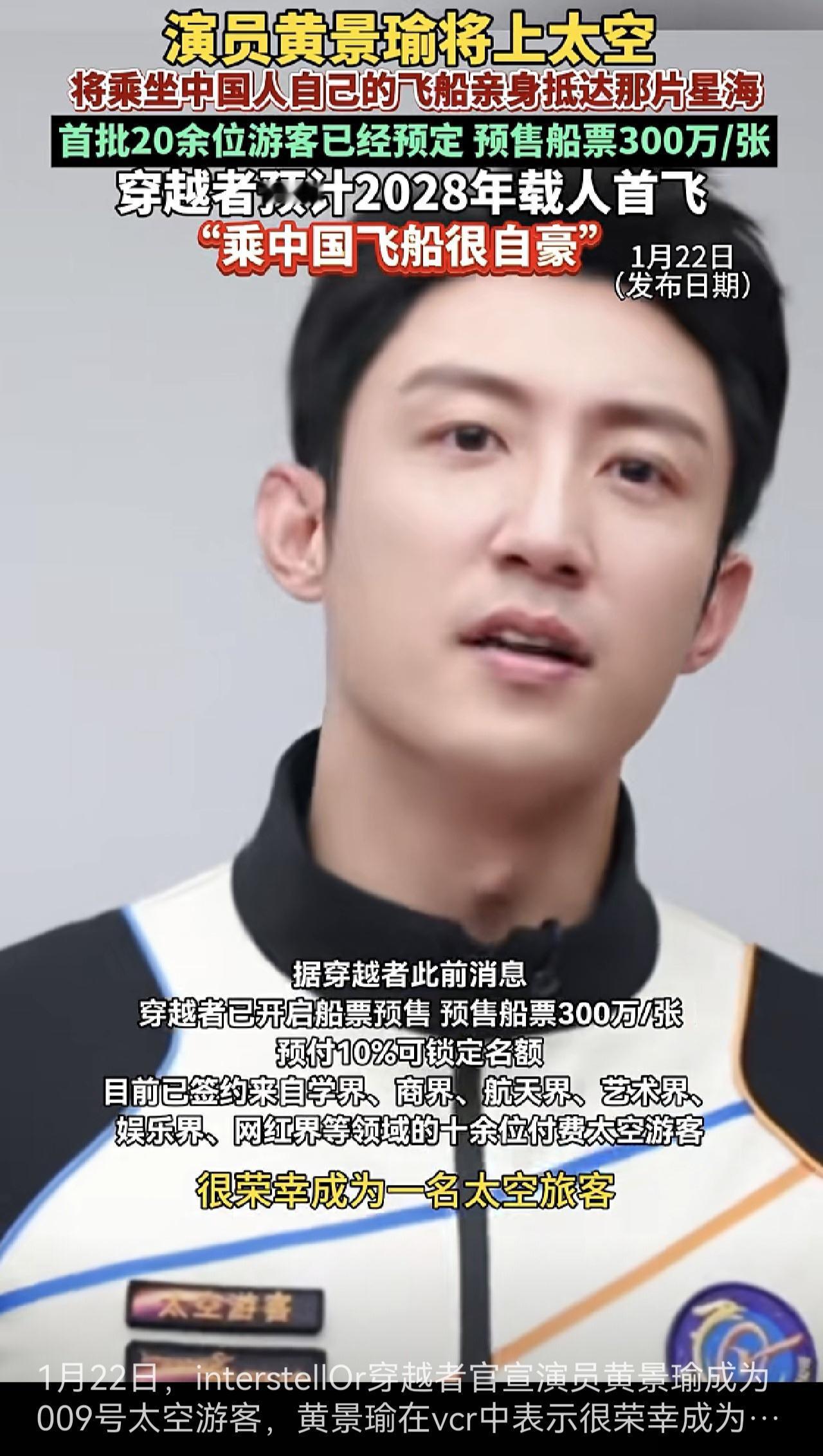 黄景瑜要玩出太空了,他官宣自己成为一名太空游客,计划2028年前后上太空。 不