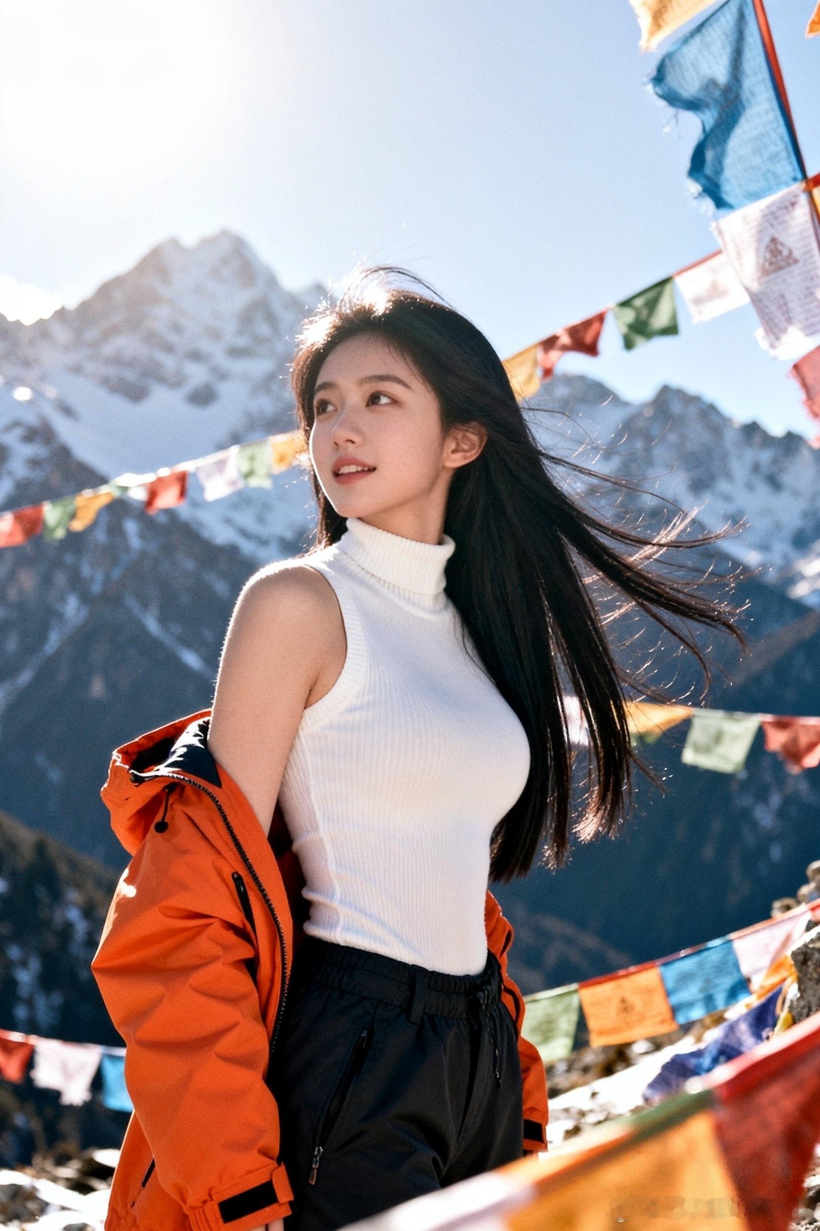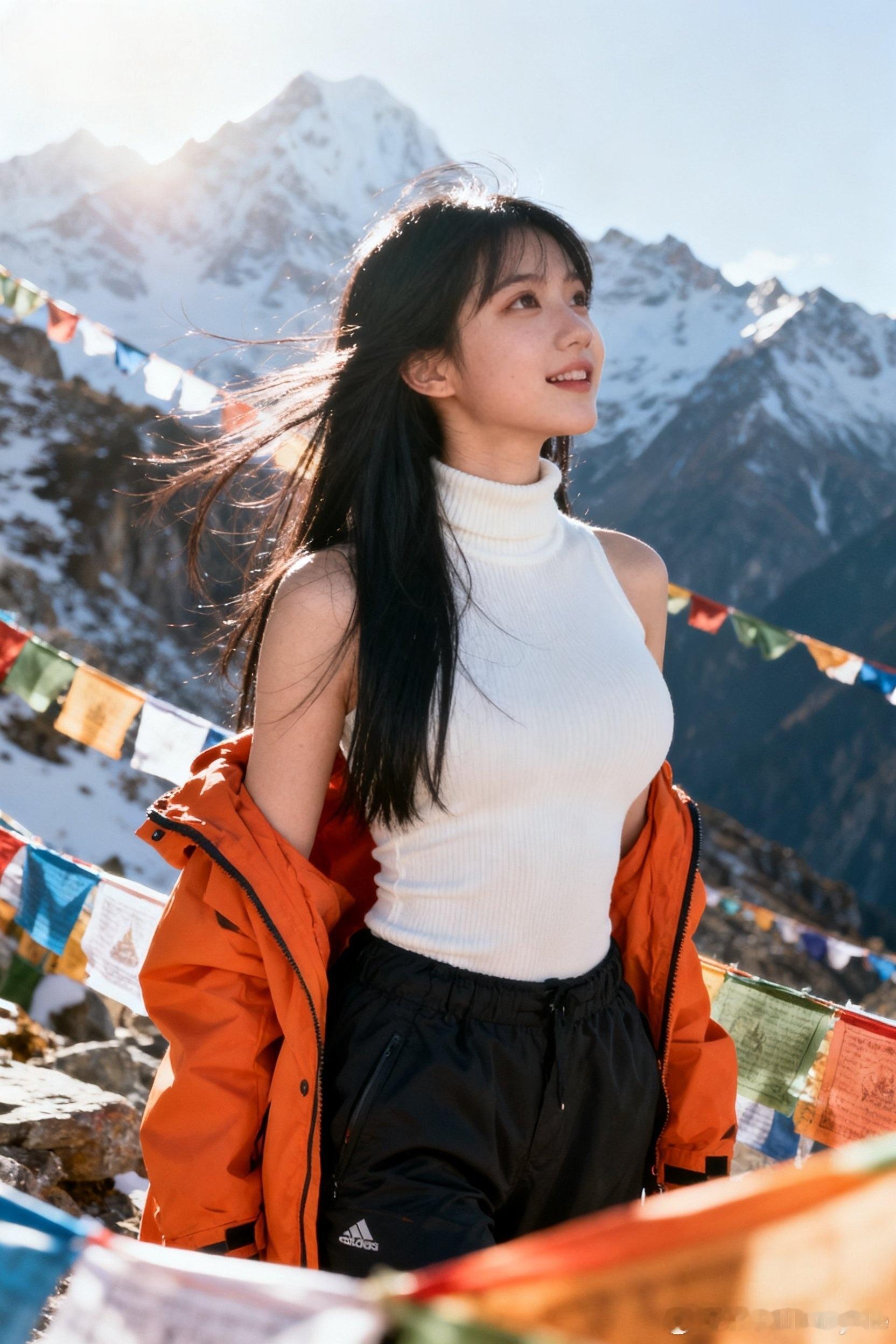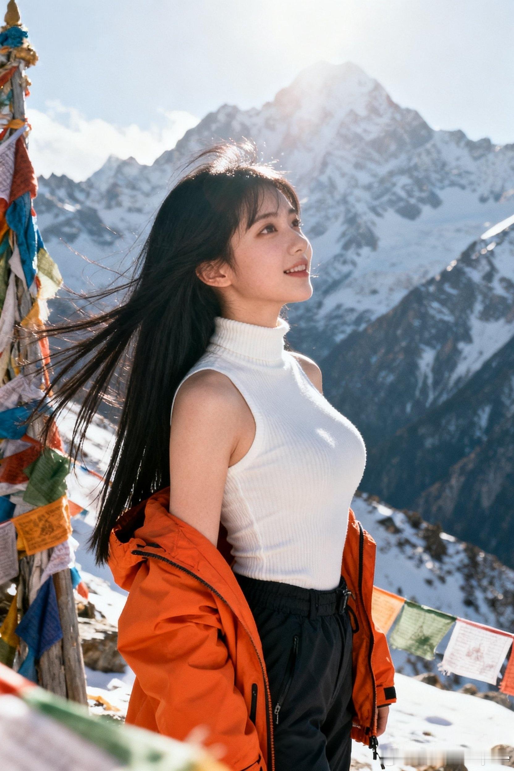 雪山下的少女,阳光下的微笑,好治愈!这就是登高的意义。当你克服困难到达高处的时候