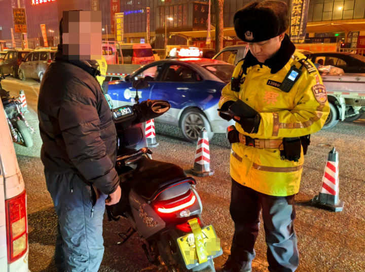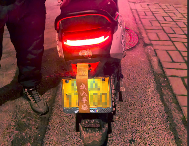 2025年12月17日22时,济南市公安局交通管理支队天桥区大队堤口路中队民警在历山北路开展交通违法整治行动时,一名驾驶机动二轮摩托车的驾驶人被民警拦下。经检查车辆,民警发现该车辆后号牌竟用一块印有“出入平安”的装饰带遮挡。