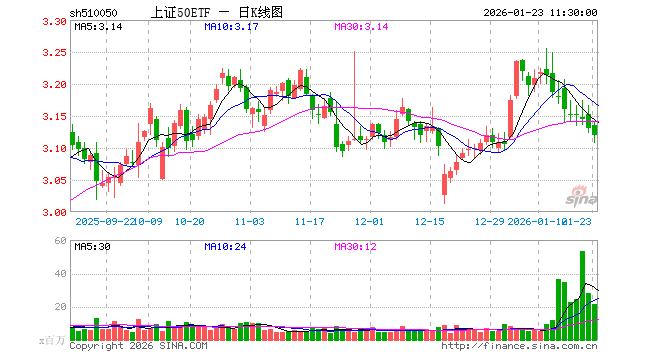 1月23日,截止午间收盘,上证50ETF(510050)跌0.38%,报3.119元,成交额66.95亿元。上证50ETF(510050)重仓股方面,贵州茅台截止午盘涨0.14%,中国平安跌0.35%,紫金矿业涨1.01%,招商银行涨0.00%,兴业银行跌0.10%,长江电力跌0.65%,寒武纪跌1.77%,中信证券跌0.14%,恒瑞医药涨0.17%,工商银行跌0.28%。