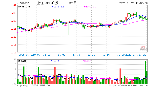 1月23日,截止午间收盘,上证50ETF广发(510950)跌0.46%,报1.303元,成交额1352.81万元。上证50ETF广发(510950)重仓股方面,贵州茅台截止午盘涨0.14%,中国平安跌0.35%,紫金矿业涨1.01%,招商银行涨0.00%,兴业银行跌0.10%,长江电力跌0.65%,寒武纪跌1.77%,中信证券跌0.14%,恒瑞医药涨0.17%,工商银行跌0.28%。