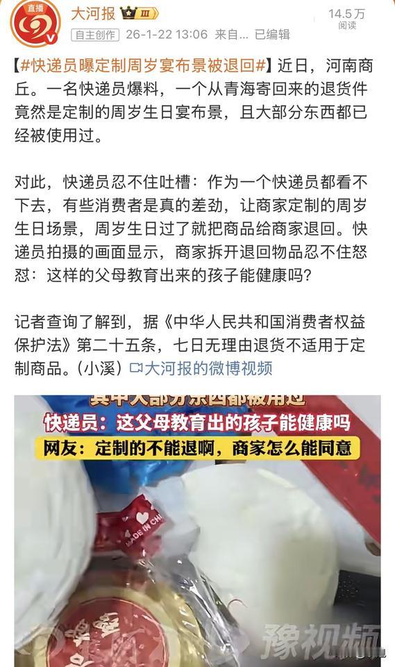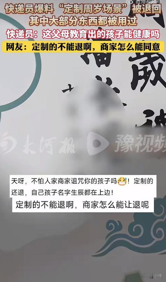 太坏了!近日,快递员小李的手停在半空,那个从青海退回的包裹,封箱胶带缠得歪歪扭扭,凑近了能闻到一股甜腻腻的奶油味混着纸箱的潮气。 打开一看,他愣了。里面是一整套周岁宴的布景,但全是用过的。背景板背面粘满干涸的双面胶,有些地方都撕烂了。装饰的彩花皱成一团,所有东西都像狂欢后疲惫的垃圾。 定制的金色字写着孩子的名字和生日。宴会的热闹仿佛还在眼前,但此刻只剩下狼藉。 商家接过箱子时,手有点抖。他做的这套东西,全世界独一份,现在被用过、被弄脏,又回到了他手里。他盯着那些专属的名字和祝福语,这些东西再也卖不出去了。他憋了半天,说出一句:“这样的父母,教出的孩子能学什么样?” 这话很冲,但小李觉得能理解。干这行见多了退货,但这次不一样。这不是普通的商品,这是别人按你要求一点点做出来的心血。用完就退,这算什么? 事情在网上炸了。网友很快扒出了这家人。有人找到了他们晒在网上的周岁宴照片,背景、名字全对得上。照片里孩子可爱,家里看着也不像缺钱。就为了省这一百来块钱,把用过的、印着孩子名字的定制布景退回去,图啥呢? 接着,这家人的正脸照、全家福甚至大概住址都被晒了出来。他们的社交账号被骂到关闭,彻底“社死”了。本想白嫖几十块,结果赔上了全家的脸面。 法律写得明明白白,《消费者权益保护法》规定,消费者定做的商品,不适用七天无理由退货。这不是钻空子,这是明摆着欺负人。他们赌的是商家怕麻烦、怕差评,会忍气吞声。 这件事最让人难受的不是钱,是那份算计和冷漠。一场为爱庆祝的仪式,最后变成了一次精明的、占便宜的交易。那些写给孩子的祝福语,在退货申请面前显得无比讽刺。 你对这种用完定制商品再退货的行为怎么看?如果你是小本经营的商家,遇到这种事会怎么处理?
