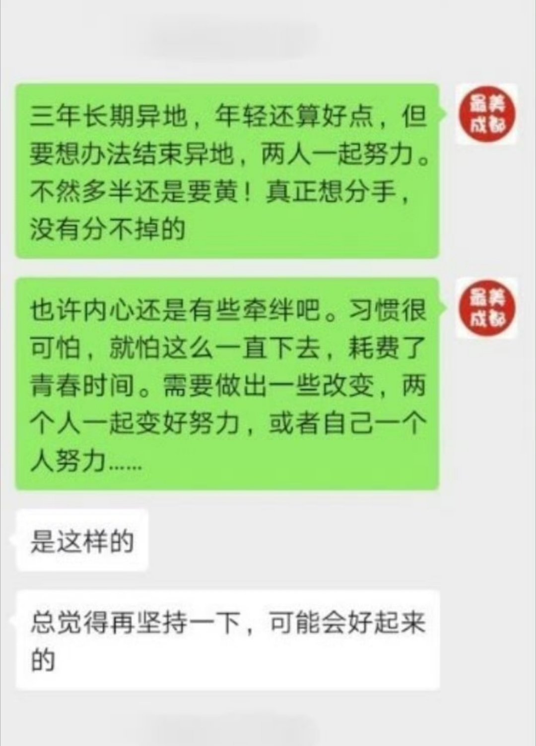【异地恋3年分又分不掉,自己很压抑】小美,我和男朋友在一起3年,但长期异地。总觉得再坚持一下可能就会好起来,就这么来回纠缠。现在自己很压抑,都没有精神去工作生活了!到底什么样的爱情才算好呢? 成年人的顶级能力是社会化程度你谈过异地恋吗?谈了几年、最后结局怎样?过年红包掏空了父亲一年的收入 成都