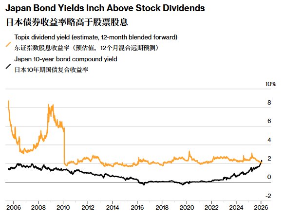 格隆汇1月23日丨在近期日本主权债务市场遭遇抛售之后,日本股票的股息收益率至少二十年来首次低于10年期日债的收益率。东证指数股票的股息收益率目前约为2.28%,低于日债2.34%的复合收益率,这是自2005年8月开始统计以来首次出现这种交叉现象。这一转变凸显了日本市场动态的变化,在日本央行开始提高利率并逐步减少债券购买后,债券收益率攀升。“曲线的交叉可能会削弱股市的一些动能,”大和证券首席策略师YugoTsuboi表示,并指出今年以派息为重点的季节性买盘可能会更加有限。