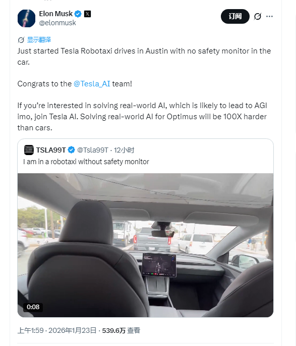 上证报中国证券网讯(实习生杨艳莹记者王宙洁)当地时间1月22日,特斯拉CEO埃隆·马斯克在社交媒体宣布,在美国得克萨斯州奥斯丁启动了特斯拉Robotaxi服务,车内没有安全监督员。