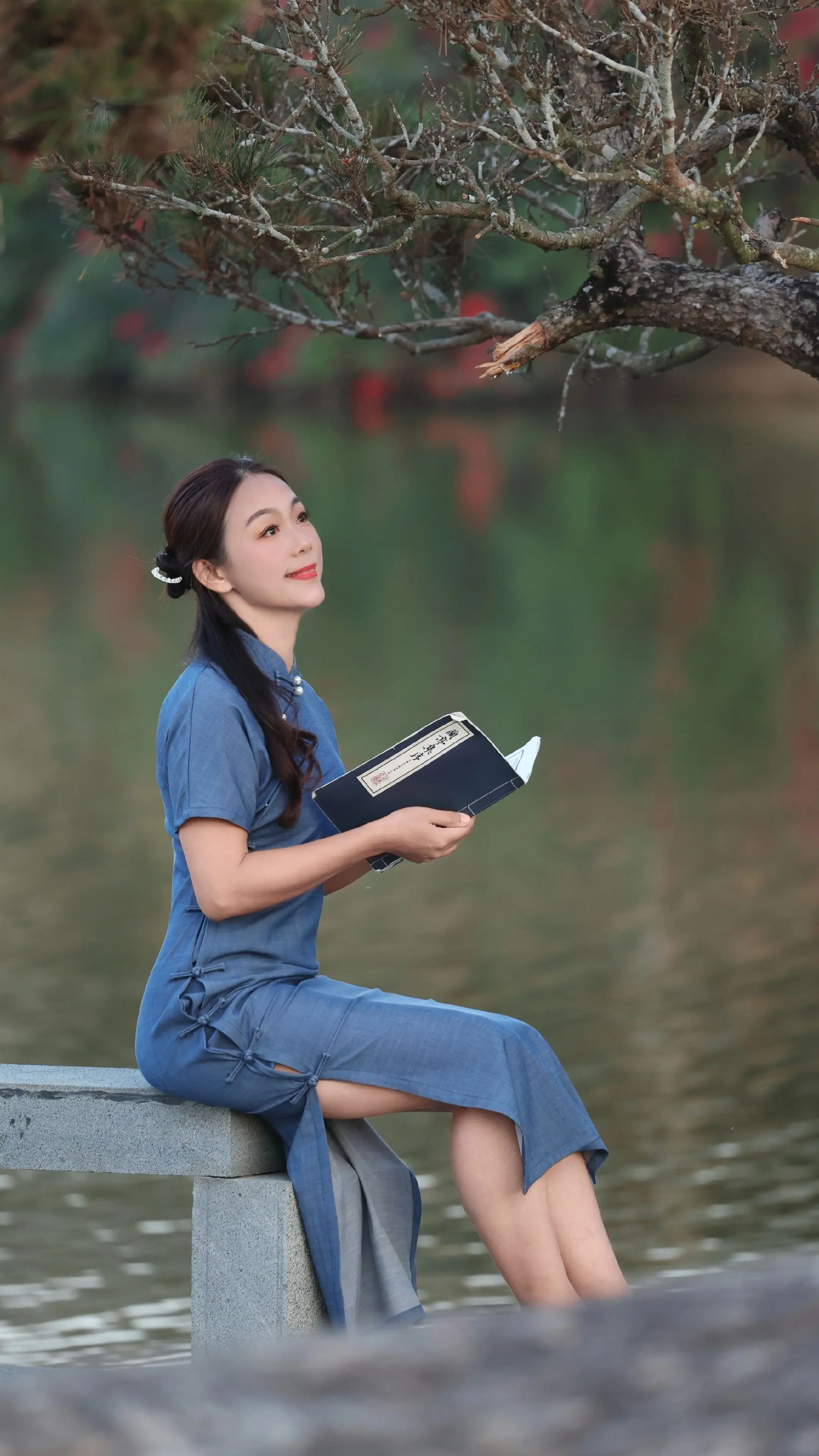 冬日生活打卡季身穿金色花旗袍的女子在西湖边写真。旗袍旗袍美女高雅气质美女