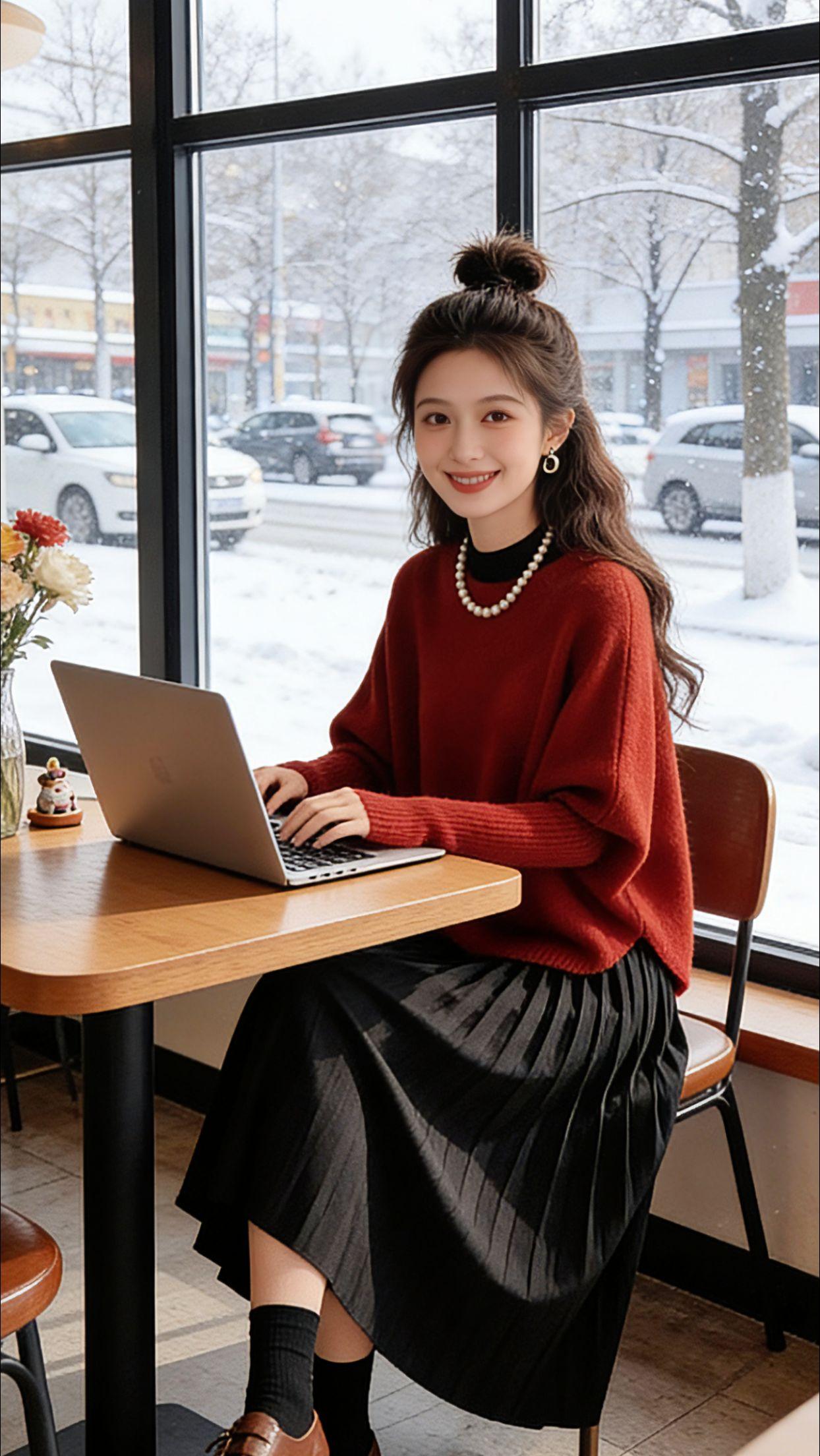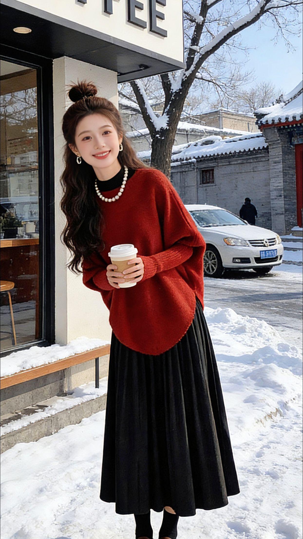 降温的冬天,Danny这套红黑针织套装太让人种草啦。软fufu的红色针织衫搭垂感黑裙,踩上复古小皮鞋,在飘雪的胡同咖啡馆前,手里的热咖啡都暖到心里。 不管是出门探店、约会还是新年走亲戚,这套都大方得体。宽松版型藏肉显瘦,红色温柔又衬气色,是不用费心搭配的省心冬装,过年穿它出门,回头率稳稳的。 新年战袍 过年穿什么 显高显瘦 一眼就心动的高质感穿搭