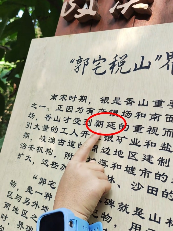 视频画面显示,在中山市岐澳古道,一名小学生站在“郭宅税山”界碑介绍牌前,指出文中有错别字,将“朝廷”写成了“朝延”。