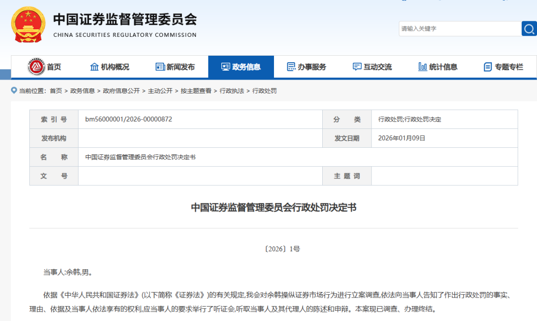 据证监会网站,中国证券监督管理委员会发布〔2026〕1号行政处罚决定书,披露了对自然人余韩操纵“博士眼镜”股票行为的处罚结果。因操纵证券市场,证监会决定没收余韩违法所得约5.11亿元,并处以等额罚款,罚没合计金额超过10.2亿元。
