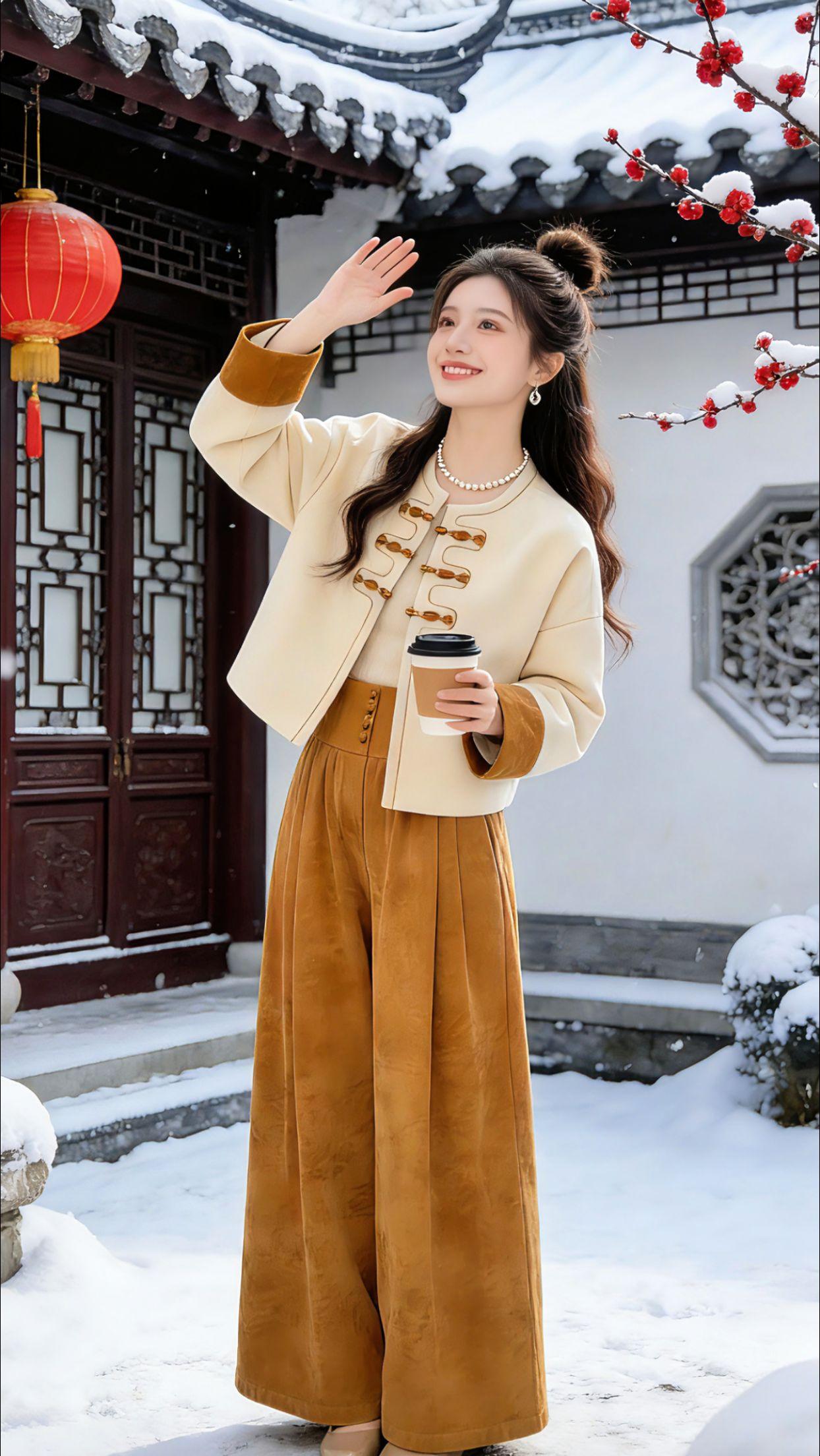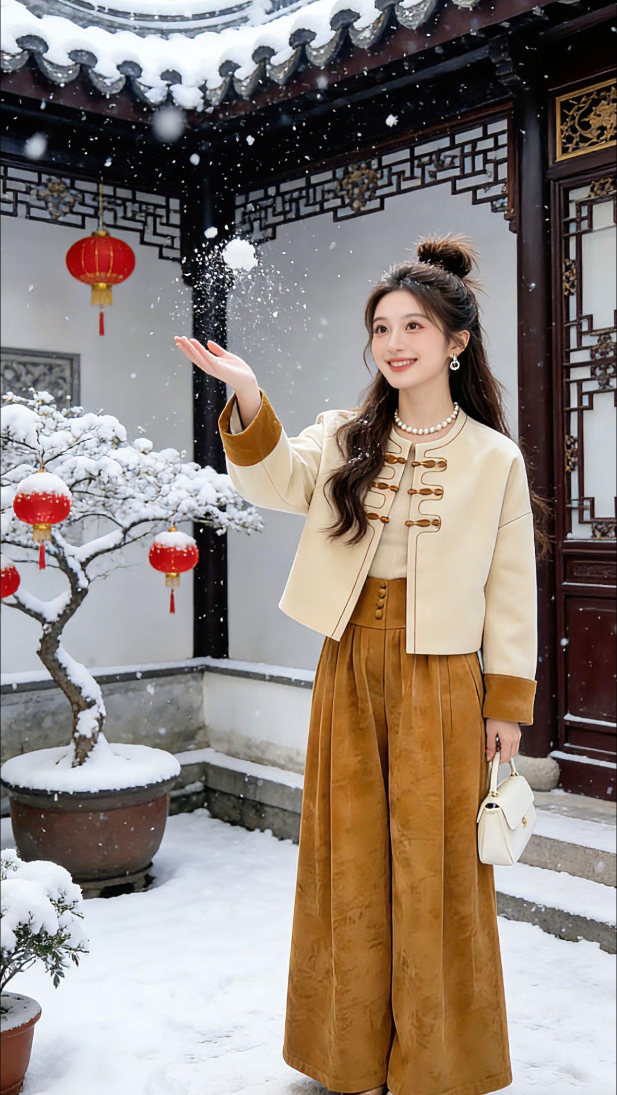 飘雪的中式庭院里,Danny这套新中式套装太戳人啦。米白盘扣上衣拼焦糖色袖口,搭垂感十足的休闲裤,踩上浅口鞋,不管是在室内整理样衣,还是在院子里接雪花、捧咖啡,温柔气质直接拉满。 宽松版型藏肉又显比例,盘扣细节透着中式雅致,日常出门、约会或新年走亲戚都合适。不用费心搭配,一套就能穿出高级感,是秋冬值得入手的省心穿搭。 新中式穿搭 冬日氛围感穿搭 过年穿什么 国风古韵