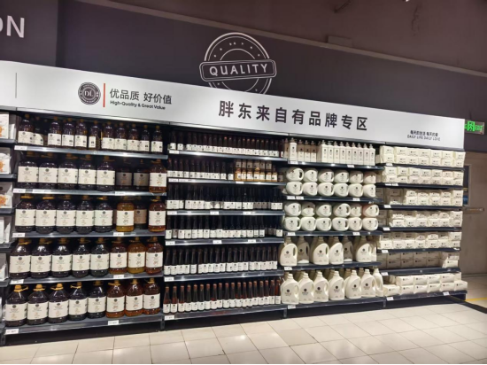 据超市工作人员介绍,调改后永辉超市的商品、人员、服务等方面都向胖东来看齐。《BUG》栏目看到,在超市内有一处推荐区,专门陈列胖东来自有品牌商品,包括饮料、酒水、食用油、洗衣液、湿纸巾等多个品类。工作人员称,胖东来专区的商品在价格上与胖东来超市是一样的。
