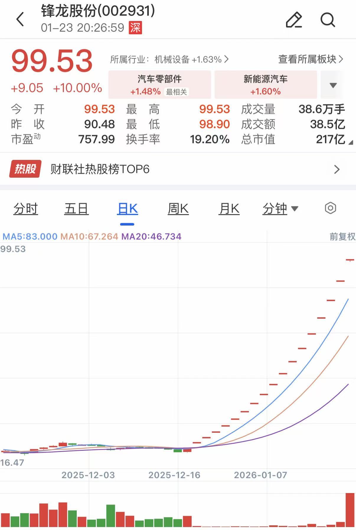 锋龙股份股价自去年12月17日启动以来,近一个月股价持续涨停。截至今日收盘,公司股价再度涨停,斩获18连板,股价报收99.53元/股,总市值飙升至217.5亿元。值得注意的是,在这波上涨行情中,锋龙股份曾于1月13日宣布停牌核查,但复牌后股价仍持续涨停。