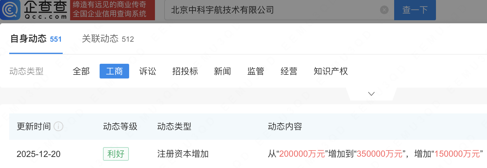 企查查APP显示,近日,北京中科宇航技术有限公司发生工商变更,注册资本由20亿元增至35亿元。企查查信息显示,该公司成立于2016年,法定代表人为杨毅强,经营范围包含:火箭控制系统研发;火箭发射设备研发和制造;火箭发动机研发与制造;民用航空器零部件设计和生产等,由中科宇航技术股份有限公司全资持股。