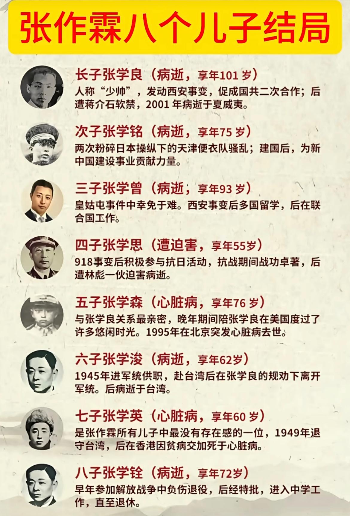 民国东北王张作霖的八个儿子结局。 其中长子张学良最为长寿,享年101岁。 张