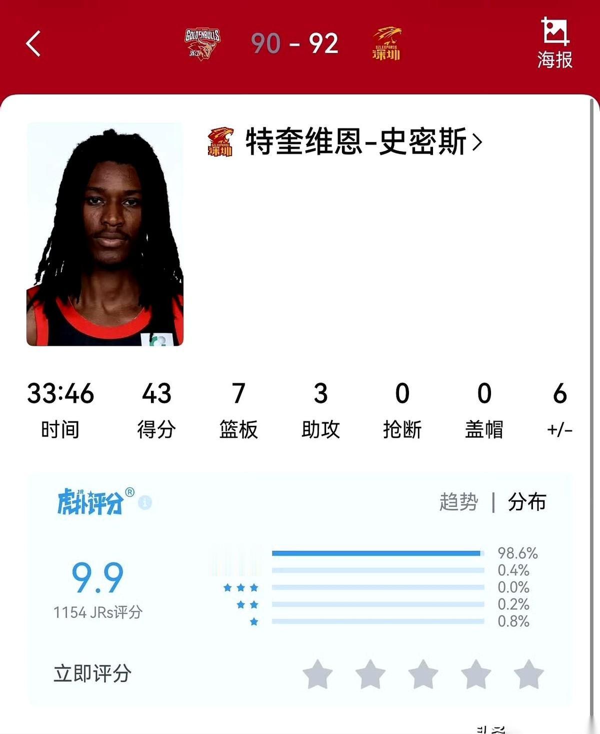 比赛还剩5.1秒,浙江队外援一记跳投,球进。89比90,主场瞬间被点燃,替补席的毛巾甩上了天。 深圳队完了。客场打到这个份上,只剩一个暂停,一个几乎不可能的底线发球。 球发出来了,直接给到史密斯。 他没往里冲,没找那个看起来更稳的两分。他接球,运了一步,直接撤到三分线外,迎着防守队员伸到脸上的胳膊,整个人拧着身子跳了起来。 时间好像停了。全场的喧嚣都挤进了这一个篮球里,看着它划过一道高高的弧线。 篮板上的红灯,亮了。 球空心入网。 92比90。刚才还沸腾的场馆,一秒钟不到,死一样的寂静。浙江队替补席跳起来一半的人,僵在原地,手还举在半空。 这还不算完。第一节结束时,就是这个史密斯,在自家篮下随手一扔,投进了一个横跨全场的压哨。 全场狂砍43分。用一个几乎不可能的进球开了头,又用一个更离谱的进球杀了尾。 我就问一句,这样的“杀手”,明年深圳队拿什么合同留?
