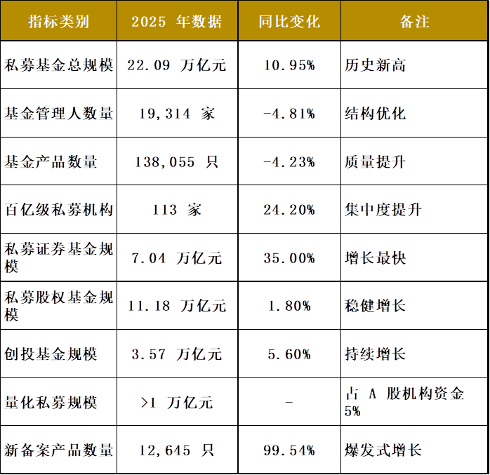 规模与质量双提升。2025年私募基金规模达到22.09万亿元的历史新高,同时行业集中度进一步提升,百亿元级机构数量达到113家,较2024年增加22家。这表明行业不仅在规模上实现了突破,更在机构质量、管理水平等方面有了显著提升。