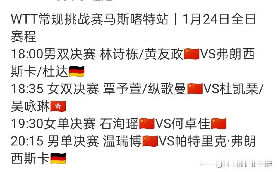 常规挑战赛今天收官,五项都晋级决赛。 混双黄友政/石洵瑶获得亚军,女单已经包揽冠亚军,男单、男双、女双今晚见分晓,但至少都是亚军。 常规挑战赛看到小将的担当,19岁小将温瑞博又打进决赛,和挑战赛不一样的是,决赛不是内战,而对手是弗朗西斯卡。 但愿小温能放手一搏,获得男单冠军杯,弥补挑战赛亚军遗憾。 男双林诗栋和黄友政一定要支棱起来,尽管对手也是德国组合,但减少失误足够坚定还是可以的。 女双覃予萱/纵歌曼也是小将组合,面对港队有挑战,但能打进决赛,小将也是可以的。 加油中国队,但愿今晚决赛都能夺冠。 图片来自网络侵权可删。