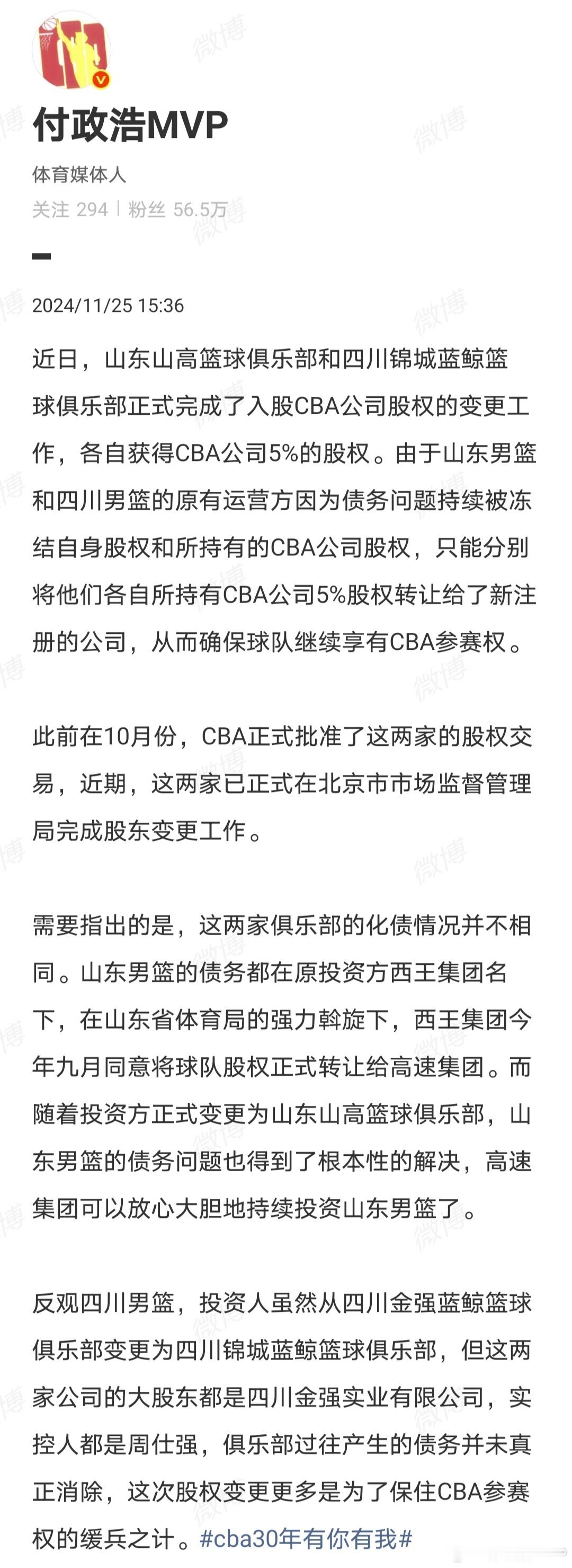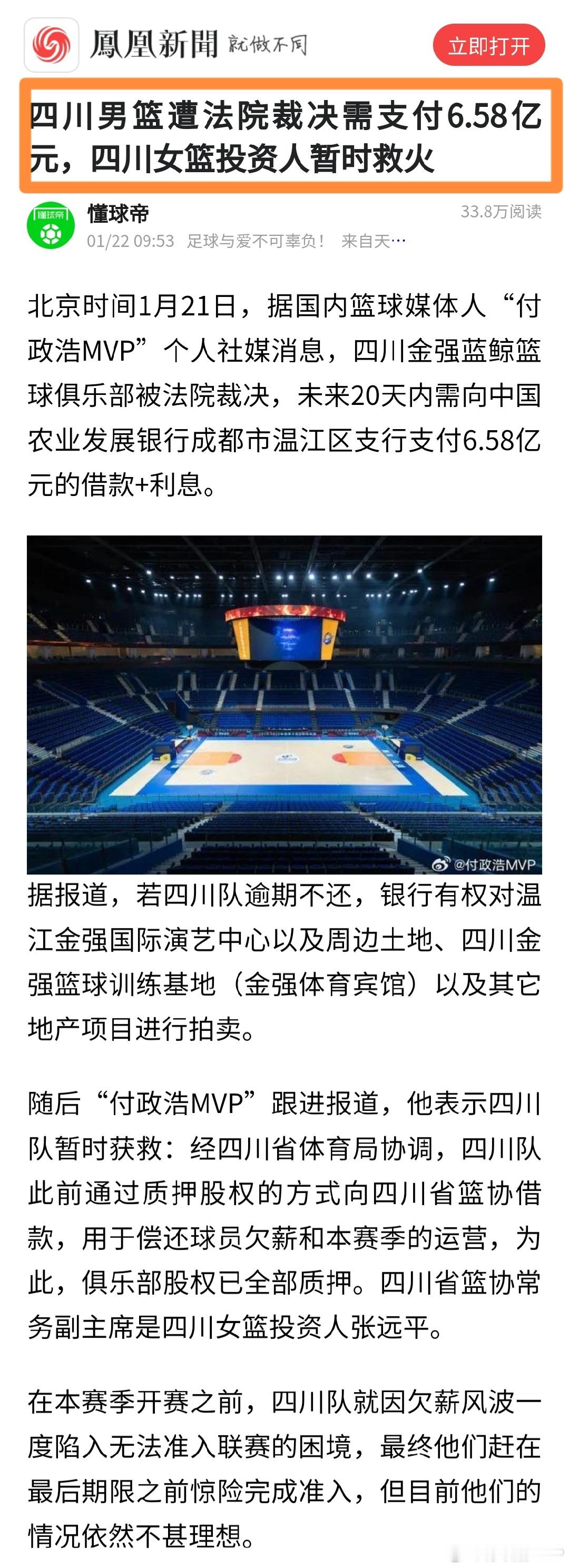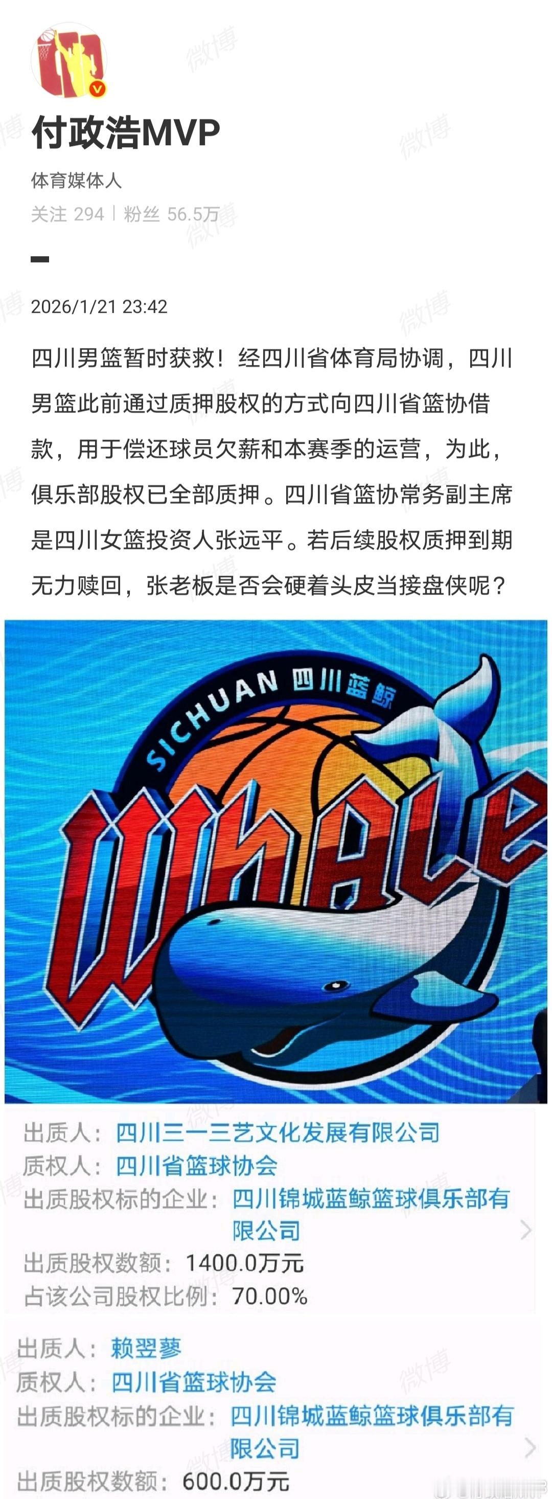 着实无语,懂球帝这复制我的稿子都能搞出假新闻。我写的清清楚楚,被判决需要支付银行6.58亿元的是四川金强蓝鲸篮球俱乐部,懂球帝倒好,大标题直接改成四川男篮需支付6.58亿。众所周知,早在2024年,四川男篮的注册主体就已从四川金强蓝鲸篮球俱乐部变更成四川锦城蓝鲸篮球俱乐部,四川男篮已经和四川金强蓝鲸篮球俱乐部完成切割。懂球帝却把四川金强蓝鲸篮球俱乐部的债务张冠李戴、归到四川男篮头上,关键还把如此低级错误硬套到我头上,有空还是先去读读我2024年写过的那些股权变更微博吧,我已经努力科普,没想到懂球帝还能搞错。特此声明:懂球帝文责自负,与我无关。再次强调,在完成股权切割后,四川金强蓝鲸篮球俱乐部的债务和四川男篮已无关系。四川男篮此前已通过将股权质押给四川省篮协,这笔借款用于解决了欠薪问题,这才通过了CBA准入。四川金强蓝鲸篮球俱乐部的债务多来自于兴建温江国际演艺中心时的借款。这两个不同公司的新闻切莫混为一谈