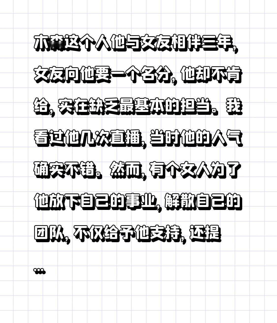 木森这个人 他与女友相伴三年,女友向他要一个名分,他却不肯给,实在缺乏最基本的担当。 我看过他几次直播,当时他的人气确实不错。然而,有个女人为了他放下自己的事业,解散自己的团队,不仅给予他支持,还提供资金。可到最后,她连一个名分都没换来。 看过他几次直播后,我对他感觉欠佳,后来便不再看了。我自认为对人的判断还算准确,这种直觉是与生俱来的。我对他就是感觉不舒服,最终就是这么回事。