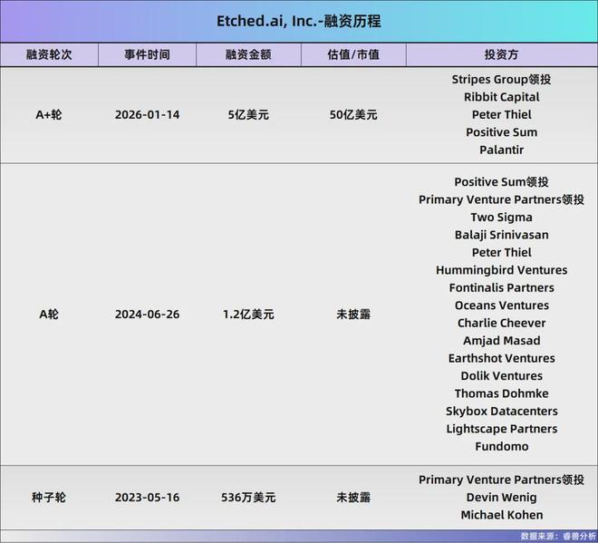 在整个融资过程中,PrimaryVenturePartners、PositiveSum、StripesGroup、PeterThiel和Palantir等著名风投公司和科技投资者的持续参与,凸显了市场对Etched.ai技术前景的高度认可。