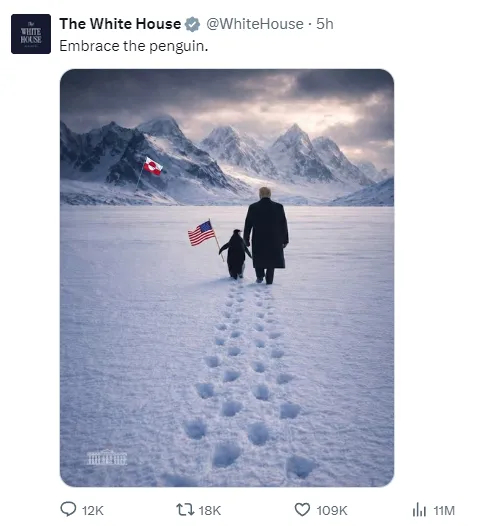 莫非整个白宫都不知道北极和格陵兰岛没有企鹅,那里是一群傻子围着一个任性、想入非非的老头?不过话说回来,北极没有企鹅,抓几只过去不就行了!多大的事,还能比抓委内瑞拉总统更难吗?最后这句评论是一位中国网友说的