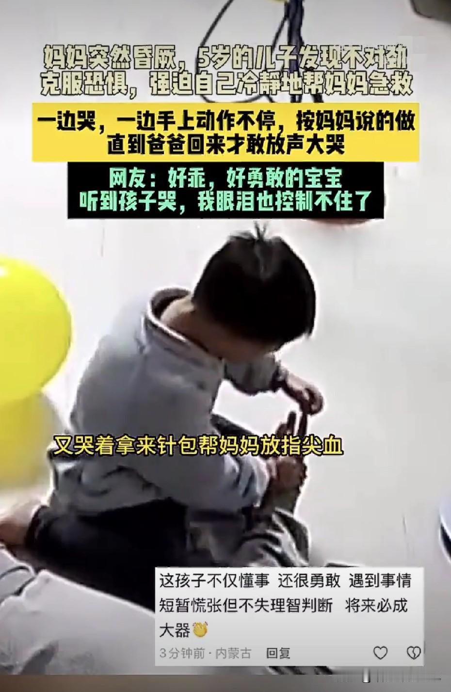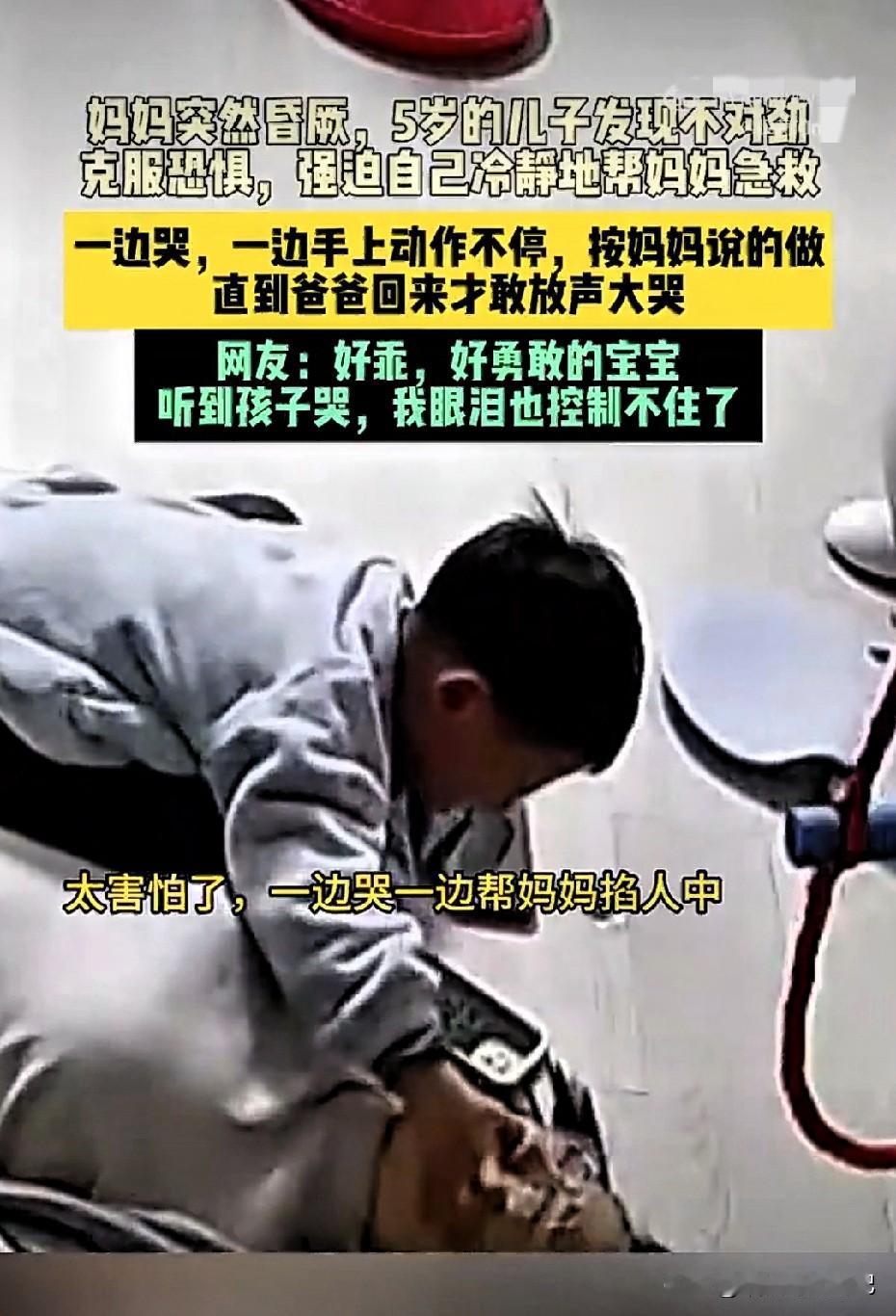 山东5岁娃“逆天”救母:一边掉泪,一边把妈妈从鬼门关拽回来! 1月19号,山东临沂。 李女士正陪5岁的童童搭积木,突然低血糖+呼吸性碱中毒,整个人像断电一样“咣当”倒地,四肢僵硬,话都说不出来。 家里就剩娃一个人。 小家伙当场吓懵,眼泪喷涌,可下一秒 ① 先给爸爸打视频:“你快回来,妈妈不动了!” ② 给妈妈操作“保命三件套”——掐人中、揉手心、指尖放血,边掉泪边操作,手抖得跟筛糠似的,却一下没停; ③ 怕电话那头的爸爸听不清,愣是把哭声调成“静音模式”,只敢瘪嘴抽泣; ④ 爸爸冲进屋那一刻,娃才“哇”地一声崩溃,哭到上气不接下气。 医生:“但凡孩子慌一点,妈妈就可能留下后遗症。” 网友热评最高赞: “他连自行车都骑不稳,却稳稳骑住了妈妈这条命。” 别再说“孩子还小啥也不懂”。 “真正的勇敢,不是不害怕,是腿都软了还把最重要的人护在身后。 ” 目前,这位妈妈已接受医院的检查,因疲劳引发呼吸性碱中毒而突然晕倒,所幸送医及时转危为安。 孩子的果敢表现值得鼓掌,但更值得传播的,是系统、科学的急救常识。父母在把“应急小妙招”教给孩子之前,不妨先让自己学会更专业、规范的处置方式,让爱与守护始终沿着正确的轨道前行。 愿每个孩子都被世界温柔环抱,愿每个家庭都在未雨绸缪的功课里,收获从容应对意外的底气,让亲情的热度永远带着稳稳的安全感。 (图源网络)