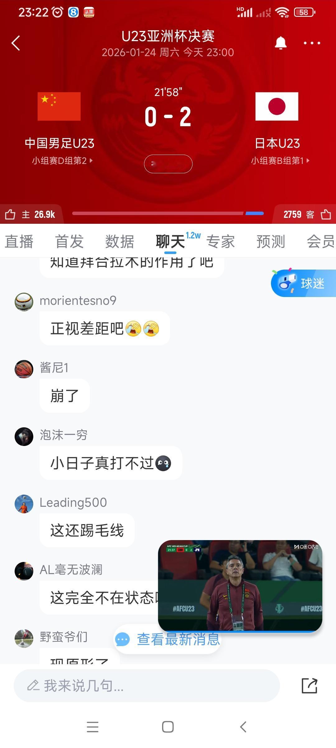 正在直播亚洲杯U23决赛,国足🆚日本男足,目前时间来到22分钟,男足2:0中国