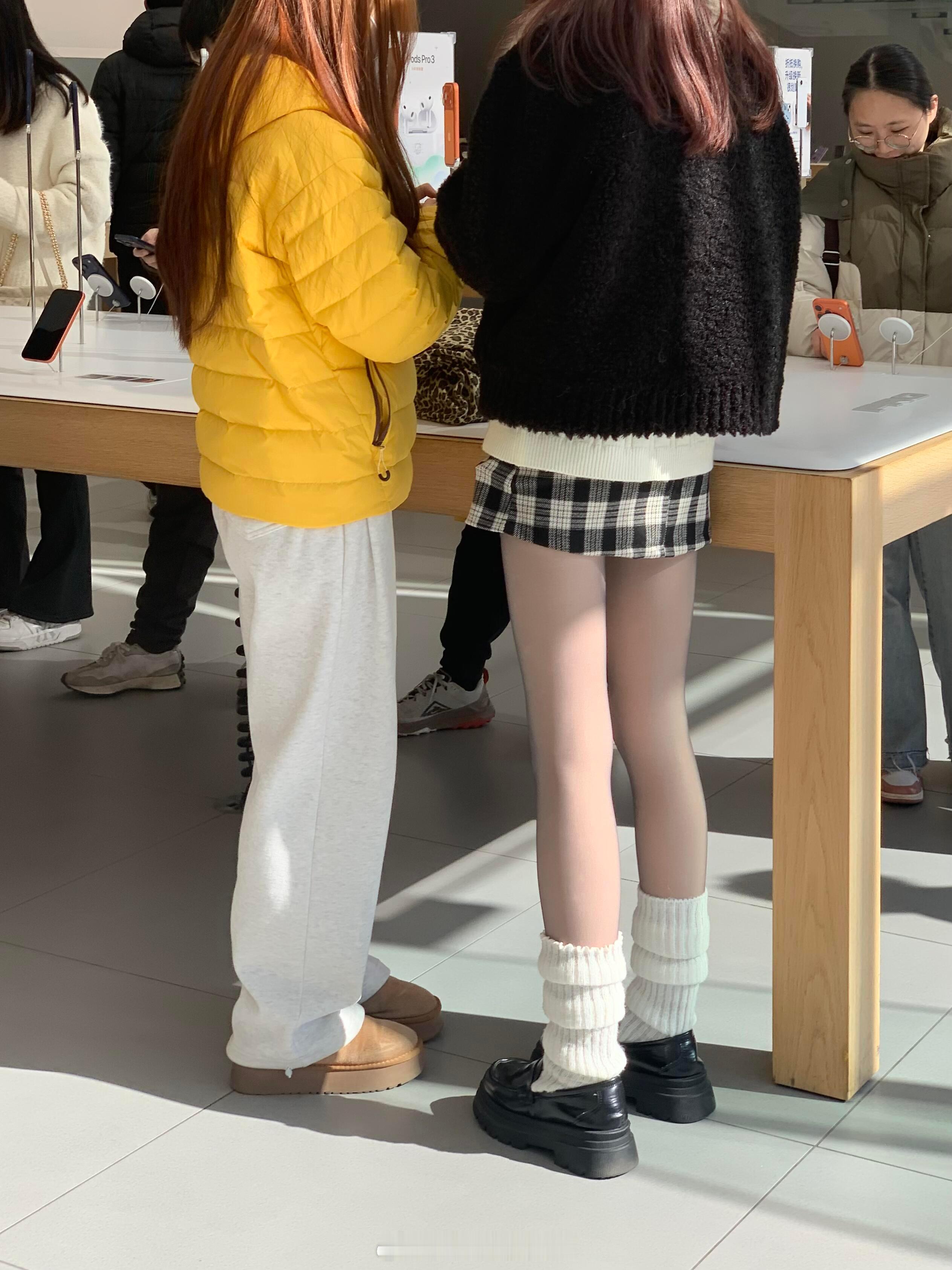 沃趣…苹果店看到的🥲…这两个小姐姐的穿搭都好好看啊!!这个卫裤看起来也好舒服啊!!右边小姐姐的黑丝看起来也好清透啊!!e人果断上去要链接!!