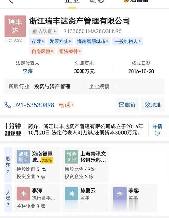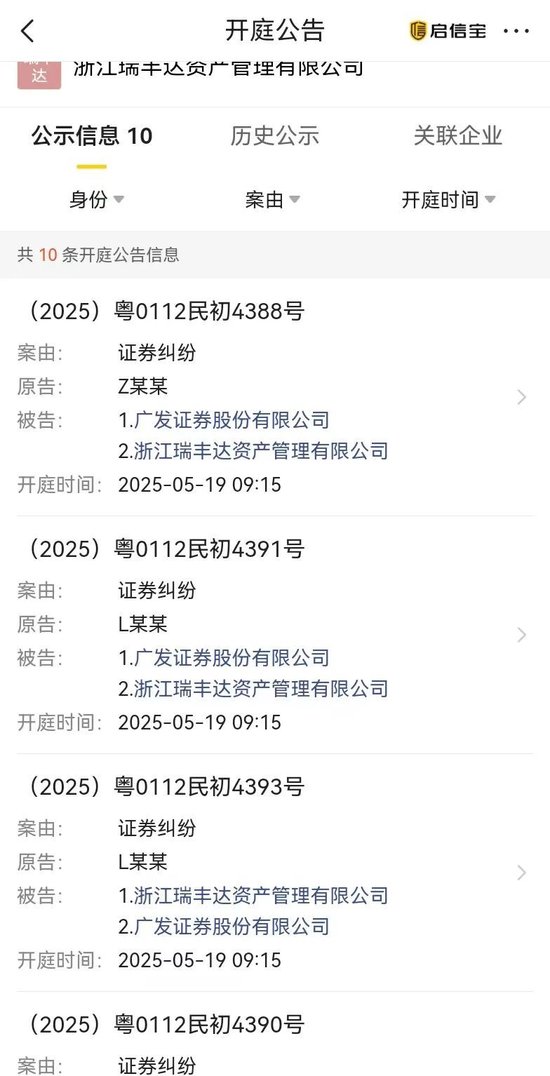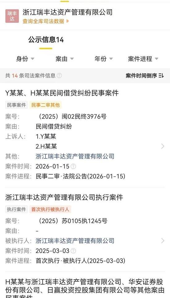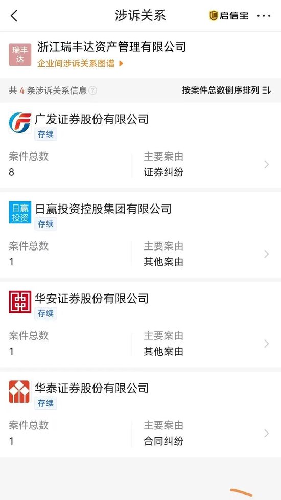 3、法院公开信息显示,浙江瑞丰达去年就被多个证券纠纷起诉,还有被强制执行的。而关联券商包括广发证券、华安证券、华泰证券等,而私募基金协会的信息显示,在被注销时瑞丰达还有基金在运行,托管人为华泰证券。