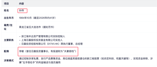当事人:孙某,男,1984年10月出生,为上海日赢、湖南北辰渔人、常州放展、江苏瑞竹、上海蒸冉的时任实际控制人,住址:黑龙江省五大连池市。