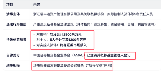 1、证监会对浙江瑞丰达资产管理有限公司(以下简称瑞丰达)及关联私募机构、实际控制人孙伟等相关责任人员违法违规行为作出行政处罚。经查,瑞丰达及关联私募机构、相关责任人员严重违反私募基金法律法规。上海证监局对瑞丰达及关联私募机构共罚没2800余万元,对5名责任人员罚款1300余万元,对瑞丰达实际控制人采取终身证券市场禁入措施。中国证券投资基金业协会注销相关私募机构管理人登记。对于相关违法行为可能涉及的犯罪问题线索,证券监管部门将坚持应移尽移的工作原则,依法依规移送公安机关。