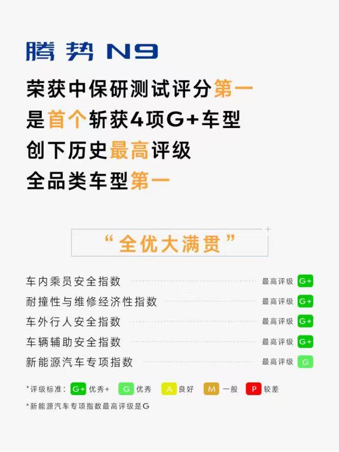 中国保险汽车安全指数(C-IASI)正式发布2025年测评车型第二次结果,比亚迪、奇瑞等国产头部品牌产品均有参加,其中比亚迪的腾势N9荣获中保研测试评分第一,是首个斩获4项G+的车型,创下历史最高评级,同时也是中保研全品类车型第一名,在五大维度均获得历史最高评级,强势通过所有测试项目,产品实力重塑行业安全标杆。 此次测评中考核的车内乘员、耐撞性与维修经济性、车外行人、车辆辅助四大核心数据,腾势均获最高等级G+,新能源汽车专项指数获G级,全维度通过所有严苛测试,真正实现“人车皆护、经济无忧”,是名副其实的安全之王。 车内乘员安全方面,腾势N9在驾驶员侧25%偏置碰撞、侧面碰撞等全项目中均获G+。正面50%偏置碰撞中,A柱零形变,安全气囊与侧气帘精准包裹假人,腿部侵入量极小。这得益于其全球首款混动CTB电池车身一体化技术,搭配高强度钢笼式车身,整车高强度钢与铝合金占比达90.5%,构筑起坚不可摧的“移动安全堡垒”。 耐撞性与维修经济性上,腾势N9凭借前后防撞梁等吸能结构优化设计,实现车身结构零损伤,低速主动安全获S级,MEB得分率89.98%,填补传统AEB低速场景空白,为泊车安全兜底。 腾势N9将安全延伸至车外,车外行人安全指数获G+,总分38.706分,两项核心测试满分。铝制机盖“太空舱”吸能设计与保险杠优化结构,大幅降低行人伤害风险。 智能安全领域,其辅助安全指数以98.7%得分率获G+,多项功能满分通关。搭载的天神之眼B辅助驾驶激光版,凭借多传感器融合技术,可在夜间、鬼探头等复杂场景毫秒级预警干预,覆盖全速域智能守护。 新能源专项指数中,腾势N9在拖底、涉水等测试中满分获G级,筑牢电池与电驱安全防线。此次全优表现,将“安全是最大的豪华”理念落地,重新定义中国高端新能源汽车实力,以硬核技术为用户每一次出行保驾护航。