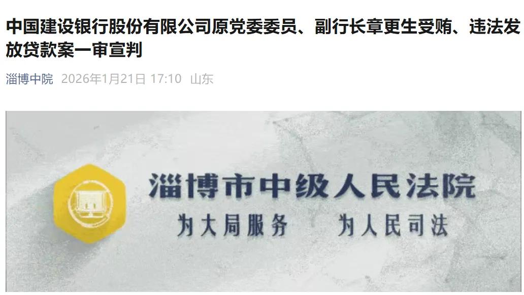 2026年1月21日,据山东省淄博市中级人民法院通报,淄博中院一审公开宣判中国建设银行股份有限公司原党委委员、副行长章更生受贿、违法发放贷款案,对被告人章更生以受贿罪判处有期徒刑十三年,并处罚金人民币四百万元,以违法发放贷款罪判处有期徒刑十年,并处罚金人民币十万元,决定执行有期徒刑十八年,并处罚金人民币四百一十万元;追缴在案的章更生受贿所得财物及孳息依法上缴国库,不足部分继续追缴。