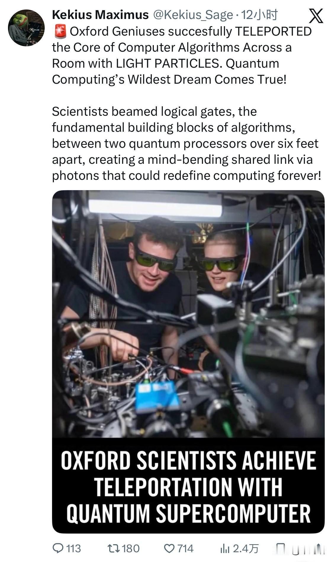 英国牛津大学的科学家们最近在量子计算领域取得了一项重大突破,成功地在两个独立的量子处理器之间“传送”了逻辑门。 这项研究的技术原理: 这项成就并非科幻小说中的物质传送,而是利用量子力学的奇特性质——量子纠缠。研究人员使用光子(光粒子)在两个相距约两米的量子模块之间建立了纠缠连接。 核心突破: 以前的研究主要集中在传送量子态,而这项研究首次展示了量子算法的基本组成部分——逻辑门——的传送。这使得两个独立的处理器能够像一个统一的量子计算机一样协同工作。 解决难题: 这一进展解决了量子计算领域的一个主要障碍——可扩展性问题。它表明未来可能不需要建造一个庞大、单一的量子计算机,而是可以通过网络连接多个较小的模块来实现扩展。 这项技术为构建“量子互联网”奠定了基础,未来遥远的处理器可以通过超安全网络进行通信、计算和感应。 这项突破展示了分布式量子信息处理在现有技术下是可行的。 这项研究的论文作者团队包括以下成员: Dougal Main (首席研究员/论文第一作者) Peter Drmota David P. Nadlinger Ellis Ainley Ayush Agrawal Bethan Nichol Raghavendra Srinivas Gabriel Araneda David Lucas (研究团队的首席研究员和英国量子计算与模拟中心首席科学家) 研究团队成员 Dougal Main 和 Beth Nichol 在实验室工作的照片被用于新闻报道。这项突破性工作已发表在《自然》杂志上。