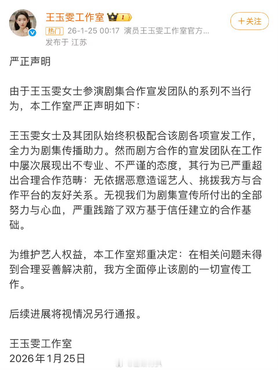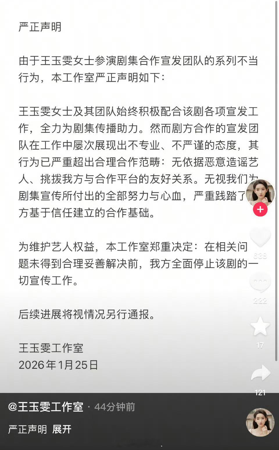 我来给大家捋捋:王姐抖🎵宣传自己的剧,发了两条,有人不乐意了,找到剧方问责:为什么你们抖🎵宣传高于我们平台,你们只能发一条。剧方:是王姐自己发的,跟我们剧方没有关系。王姐实惨,被剧方背刺。男女主自掏腰包去环球地推剧宣,自己手戳剧宣视频,朝哪拜能有这样的男女主啊,剧方真不懂的珍惜啊。王玉雯方停止突然的喜欢一切宣传工作