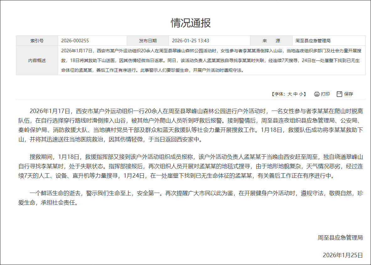 2026年1月17日,西安市某户外运动组织一行20余人在周至县翠峰山森林公园进行户外活动时,一名女性参与者李某某在爬山时脱离队伍,在自行选择穿行路线时滑倒摔入山谷,被其他户外爬山人员听到呼救后报警。接到警情后,周至县连夜组织县应急管理局、公安局、秦岭保护局、消防救援大队、当地镇村党员干部及群众和蓝天救援队等社会力量开展搜救工作。1月18日,救援队伍成功将李某某救助下山,并将其迅速送往当地医院救治,因其伤情轻微,于当日返回西安家中。