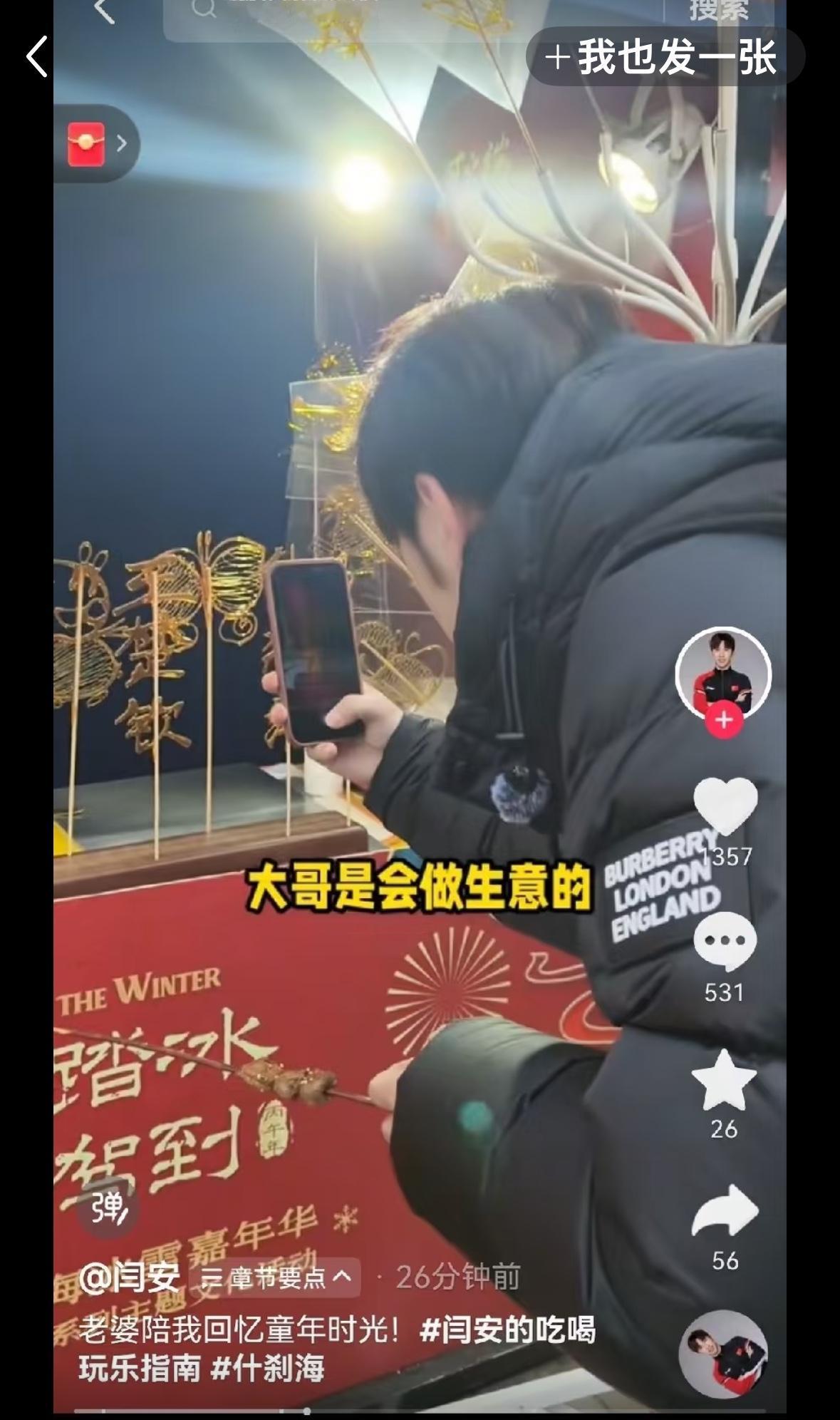 王楚钦与闫安温暖互动——帮我支持一下 闫安的视频里有一个摊主, 卖糖人的, 糖人写出王楚钦的名字, 王楚钦让闫安支持一下, 闫安说老板有眼光! 应该是闫安去什刹海玩, 糖人画了王楚钦, 大家都想吃一个王楚钦, 这摊主来不及做了! 这个摊主真有眼光, 估计是王楚钦的球迷!