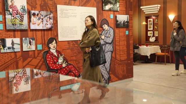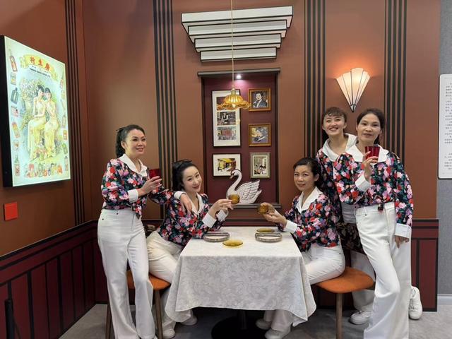 展览精心打造了海派西餐馆、理发厅和裁缝店三个场景,供市民盛装打卡,穿越回曾经。在“海派西餐厅”,陆家嘴海派秧歌队队长郑木琼、副队长许艳等人穿着复古的花衬衫,坐在餐桌前摆POSE。几人刚在开幕式上跳完广场舞《燃情岁月》,舞蹈创意取材于上世纪80年代的迪斯科元素,巧妙融合海派文化精髓与现代都市审美。“时尚是一种轮回。”两人不约而同地感慨,“这次展览主题是穿搭,看到了很多我们熟悉的衣服。”